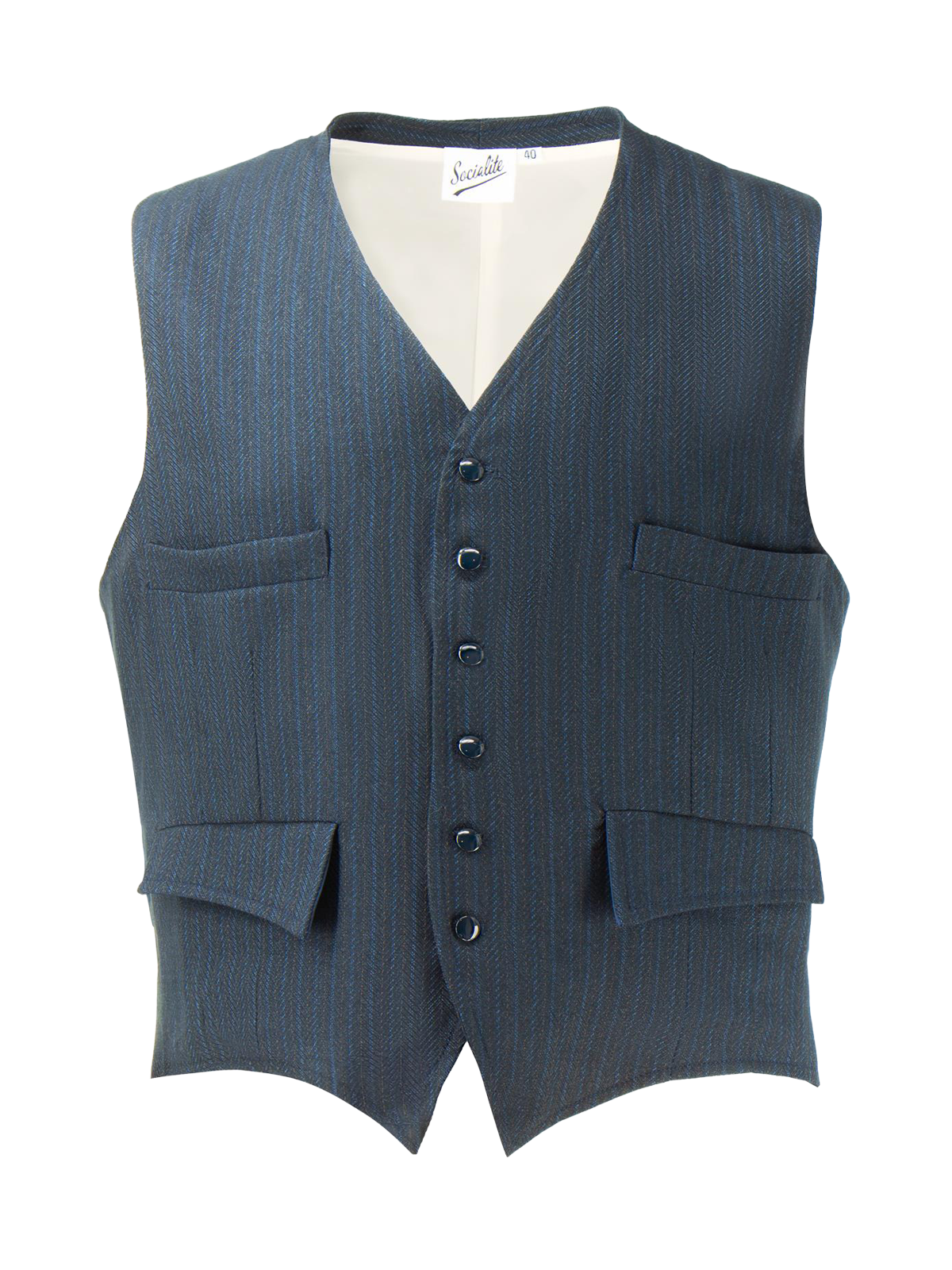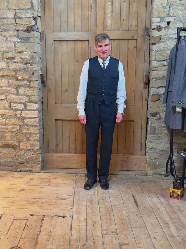 Our brand new Harry waistcoat is inspired by original 1930s - 1940s era pieces from our exclusive archives. It is a single-breasted style and available with matching fishtail back trousers in our latest weave; an indigo blue broken twill with accents of cobalt blue and tan. This is a limited edition run so buy now to avoid disappointment!!