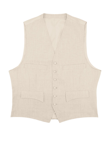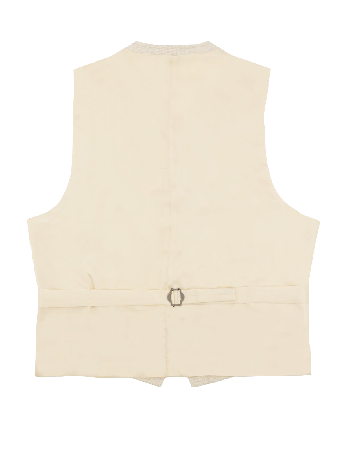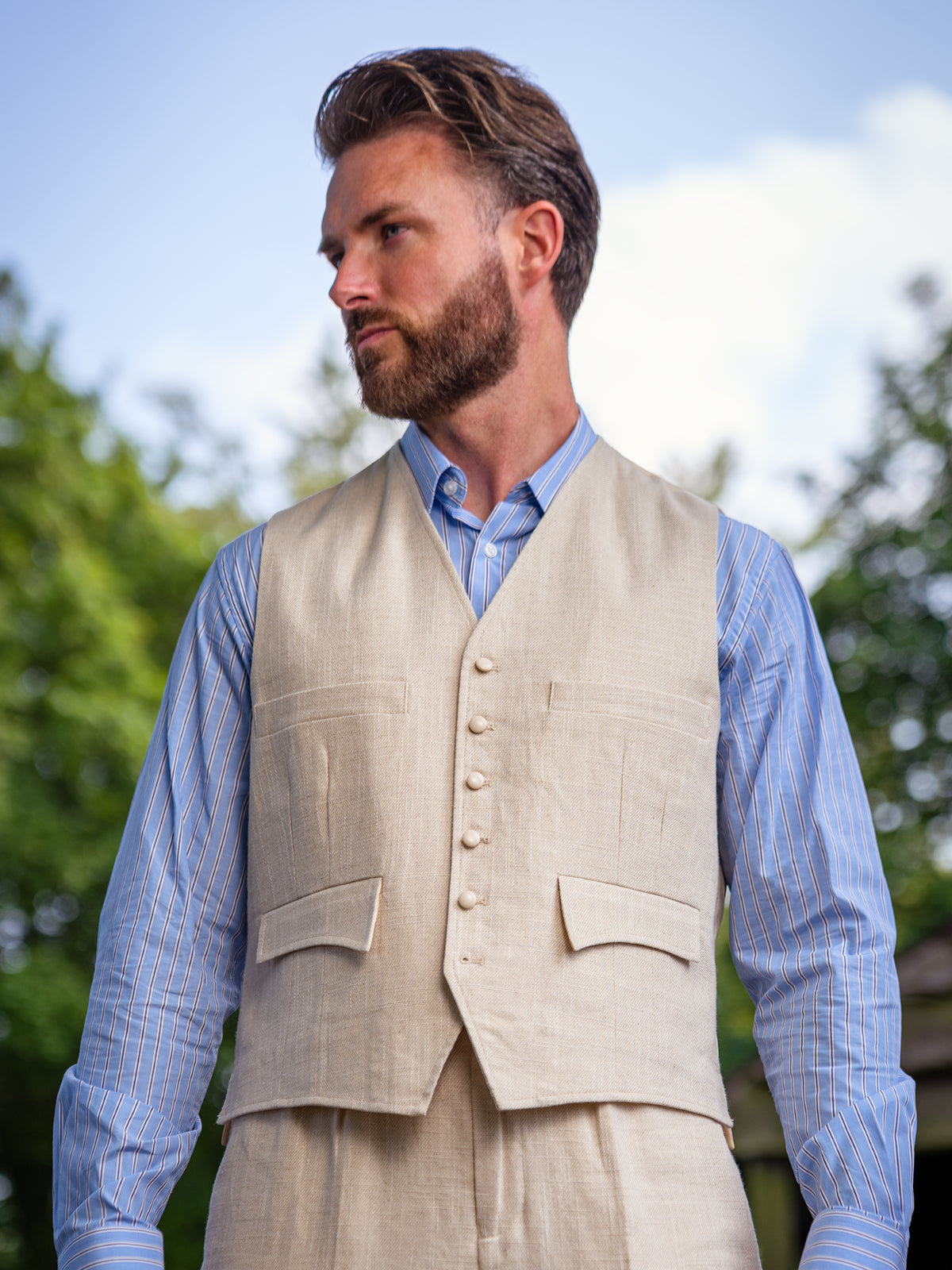 Polished and yet relaxed cream linen four-pocket waistcoat with a timeless vintage look. In response to the popular demand for our forties tropical style suit, the 'Gadabout', we've created a matching waistcoat. As always with our Socialite range, we have replicated an original vintage item.