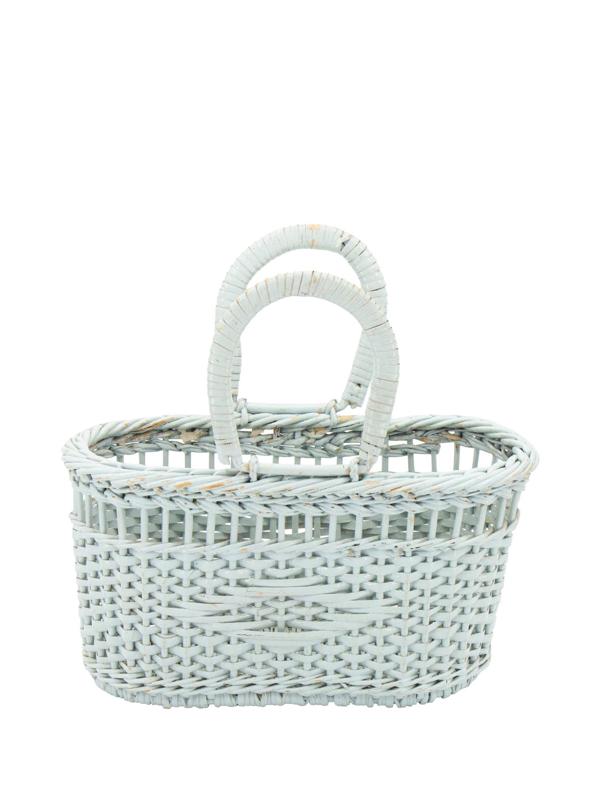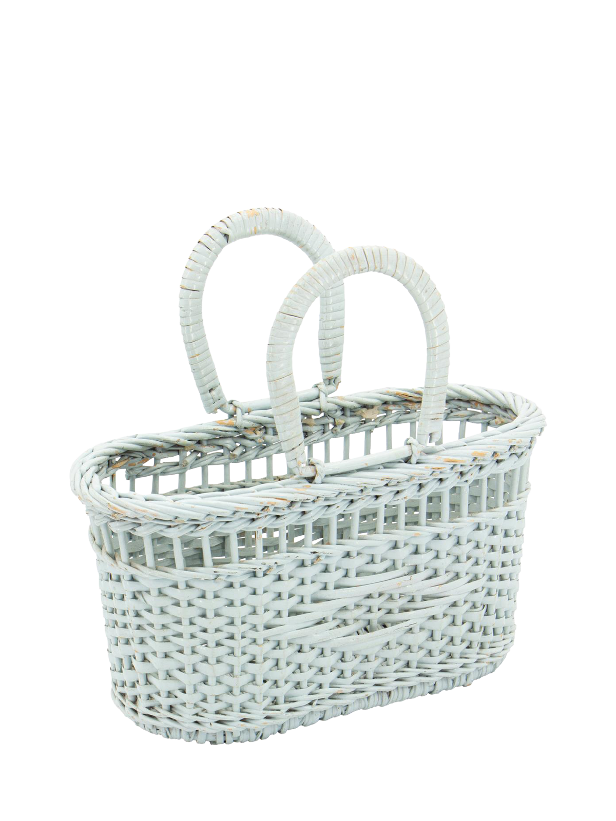 A charming small woven wicker basket bag with two hinged handles, dating from the 1940s / 50s. The paint shows areas of chipping, adding to the authentic character and one-of-a-kind appeal of this true vintage piece.