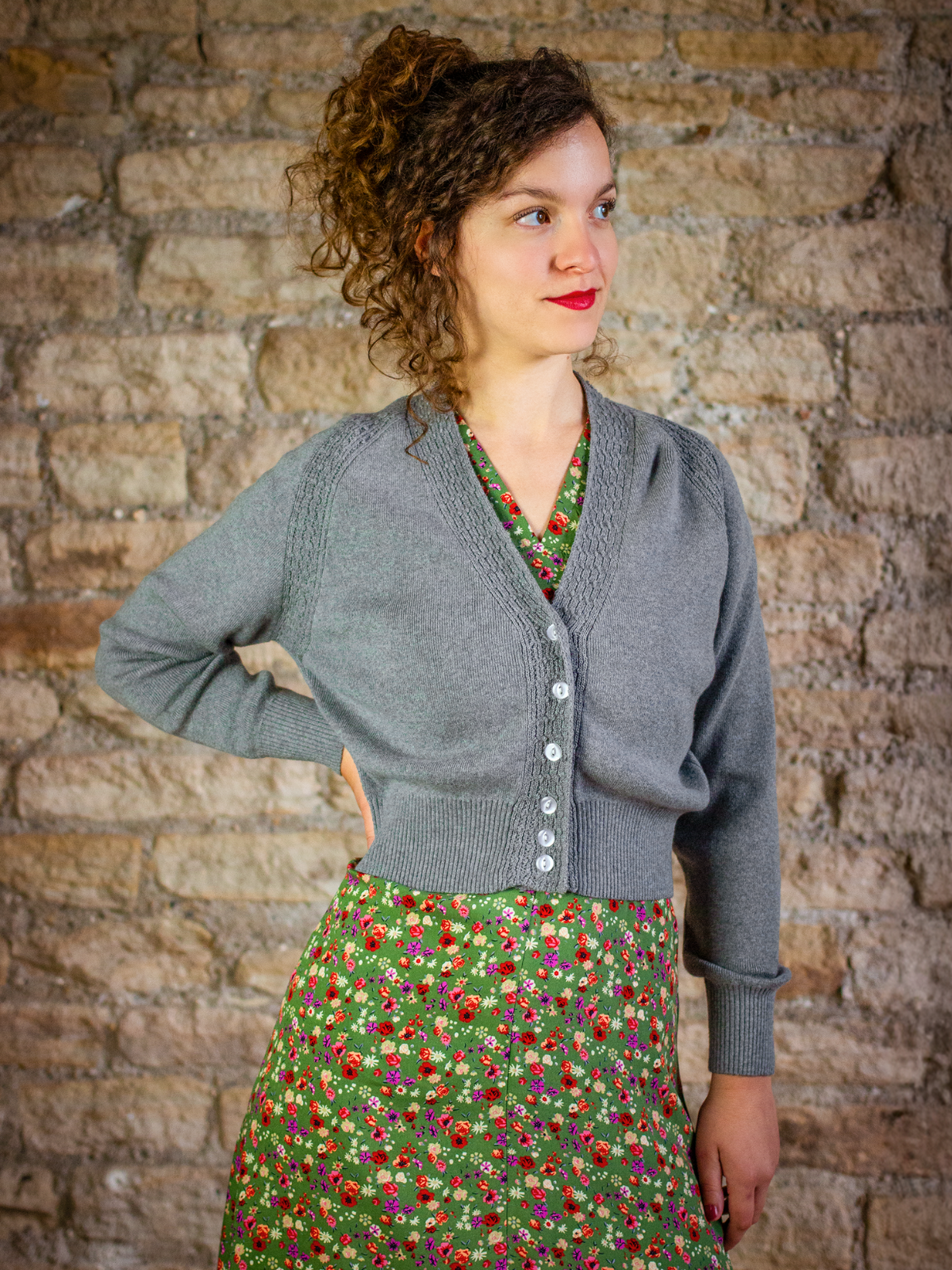 The shorter length of the Daydream cardigan makes it a perfect complement to vintage dresses or high-waisted jeans. It ends at the waist, creating a flattering silhouette and serving as an elegant addition to outfits reminiscent of the 1940s and 50s.