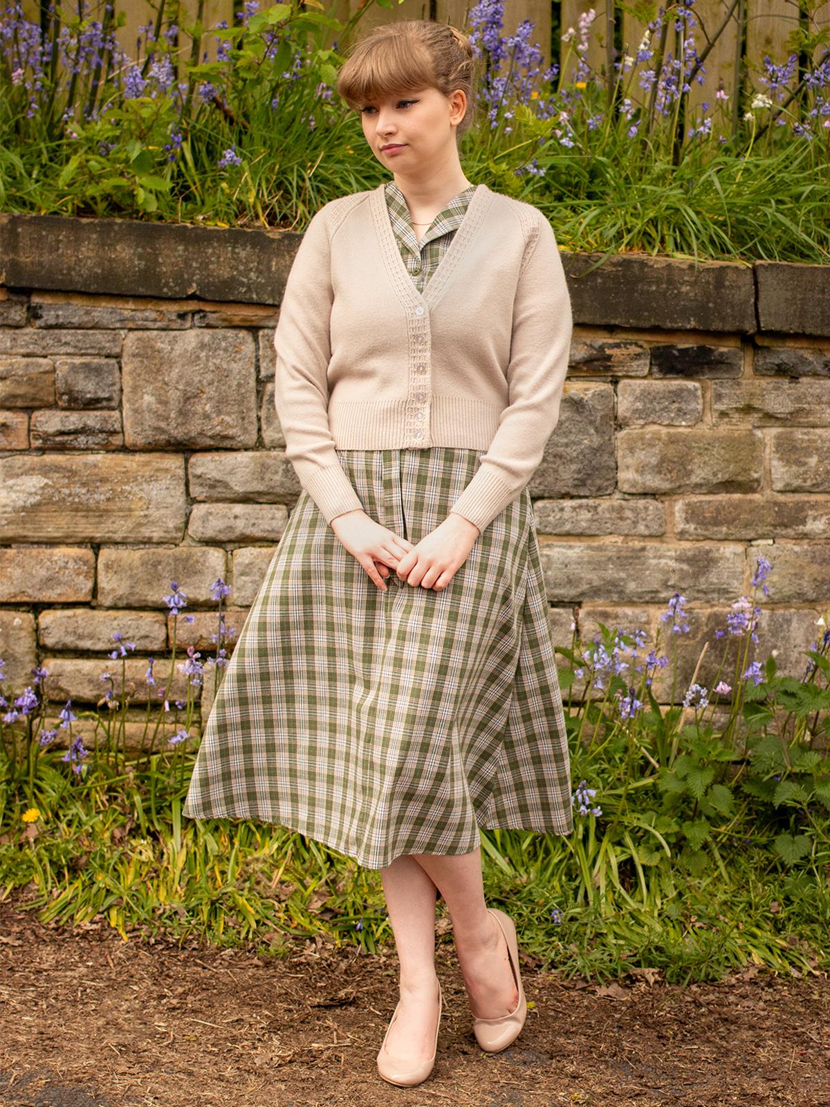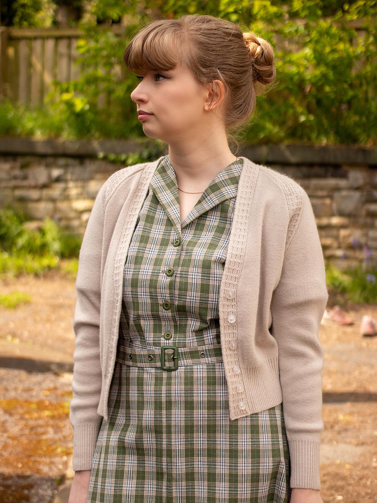 The Daydream cardigan's shorter length makes it ideal to pair with a vintage dress or high-waisted jeans, meaning it can be worn easily with any 1940s or 50s-inspired look, formal or casual.