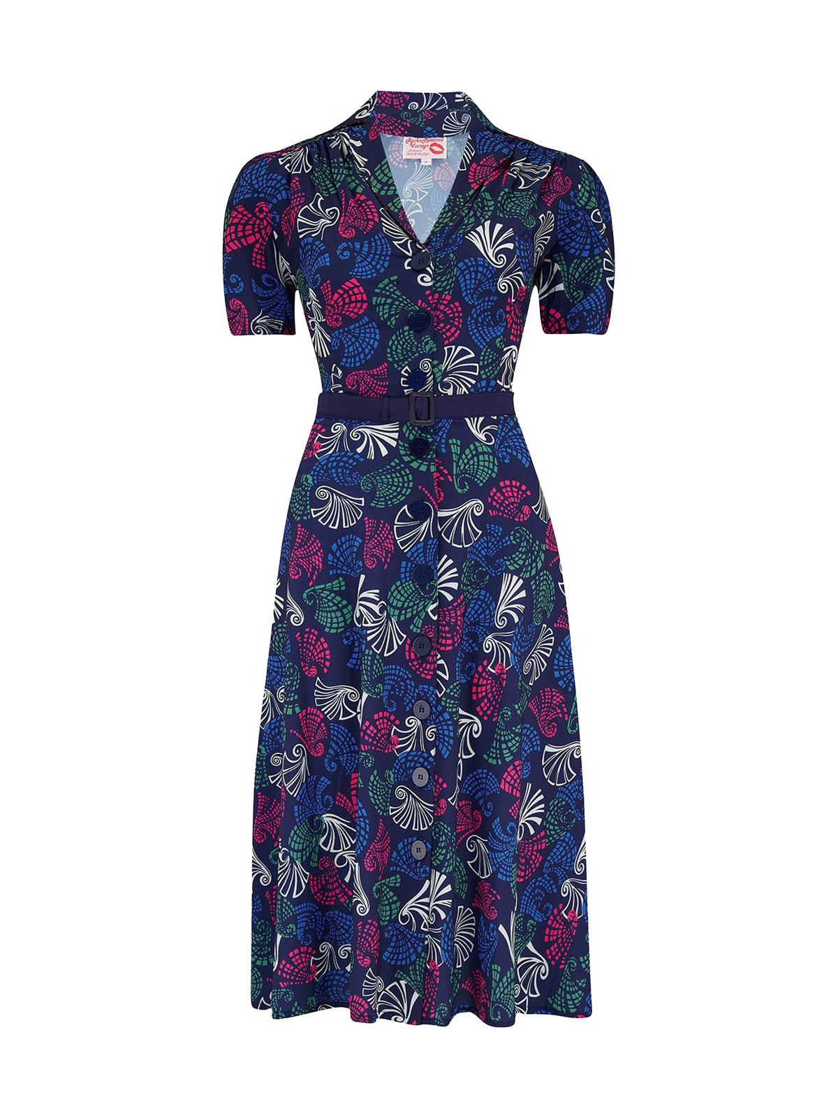 The eye-catching print is a faithful reproduction of an original 1950s fabric, showcasing green, pink, and white abstract swirls on a navy blue background. Feminine gathers at the shoulder yoke, a casual open collar, and a matching belt complete the vintage-inspired silhouette, offering both comfort and elegance for any occasion.