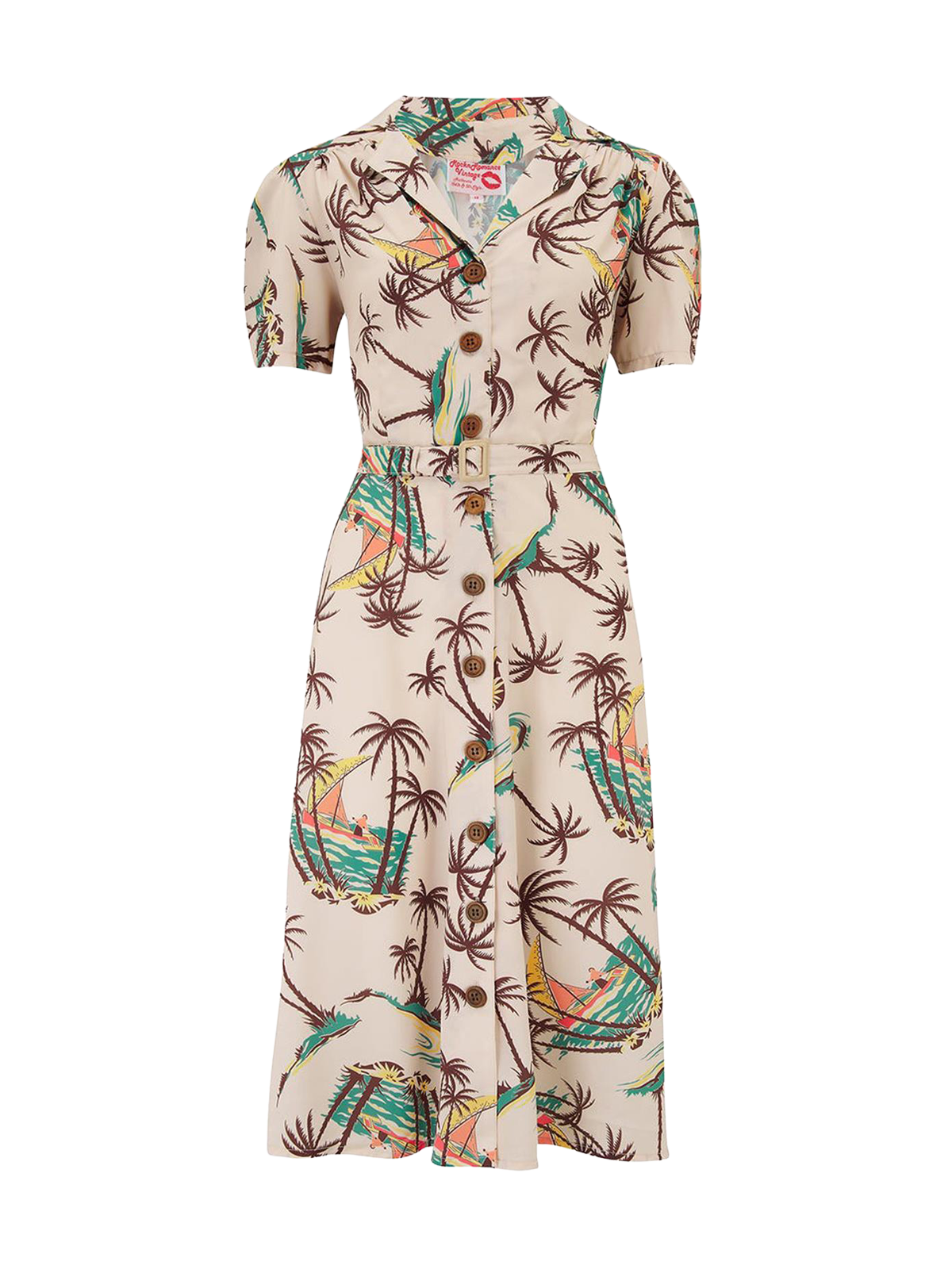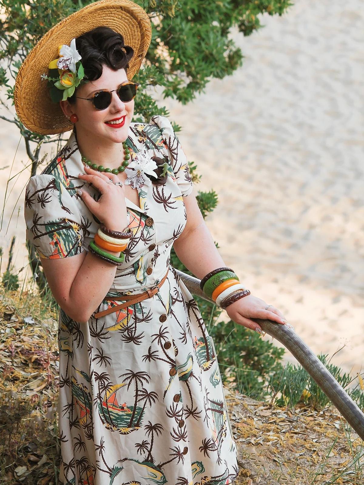 This gorgeous vintage style dress features an iconic Hawaiian print which is a direct copy of a true vintage 1950s era fabric.