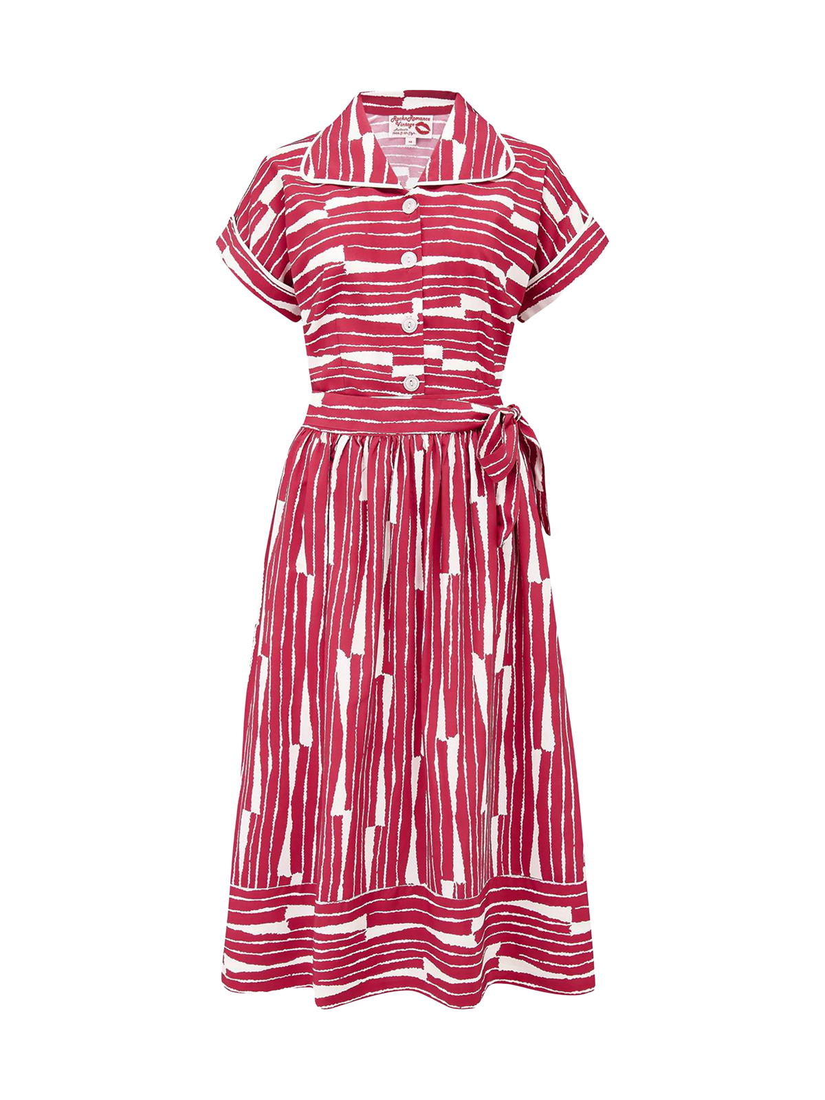 Midcentury inspired and effortlessly stylish, this two-piece blouse and skirt set brings authentic vintage flair to your wardrobe. Made from a red and white stripe crepe-feel fabric, it offers both comfort and charm with its flattering silhouette and classic retro detailing.