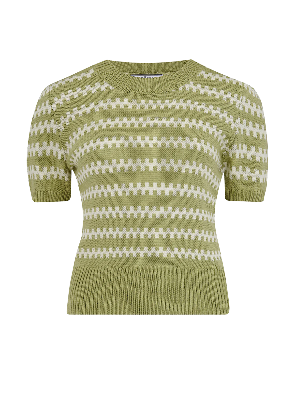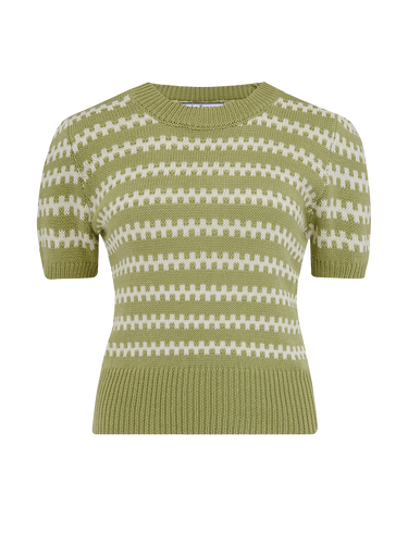 A classic pastel green knit top, with stripe detail, perfect for 1940s and 50s inspired looks. Easy to style with jeans and flats for a relaxed outfit, or layer over vintage dresses. Pair with the matching cardigan to create a versatile twinset. Finished with small neck buttons for easy wear without disturbing your hairstyle.