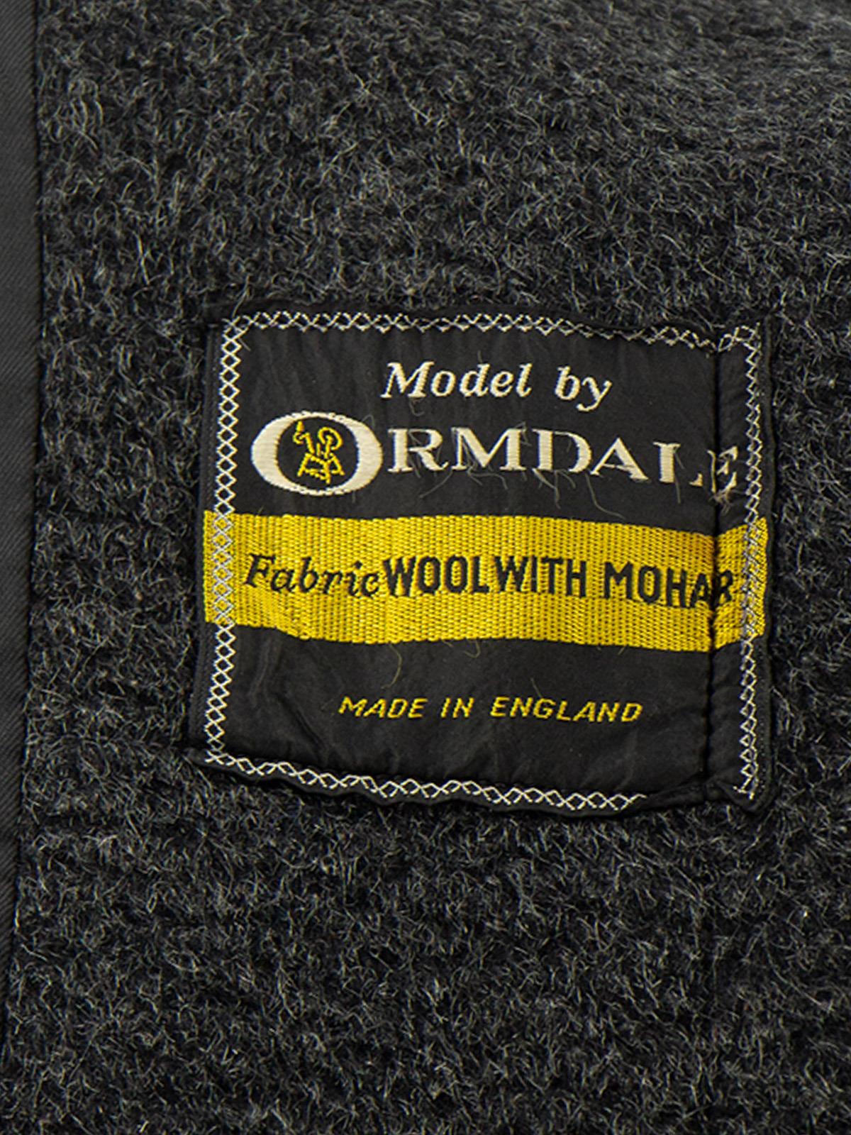 A charcoal grey, wool & mohair mix overcoat designed by Ormdale. This coat has a wonderful fleece-like texture, is fully lined and features oversize buttons and upturned cuffs.