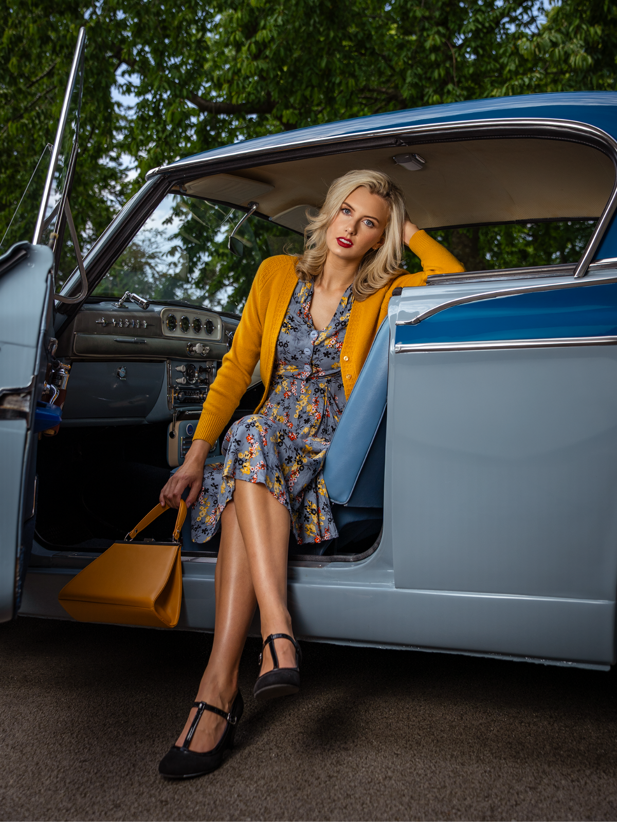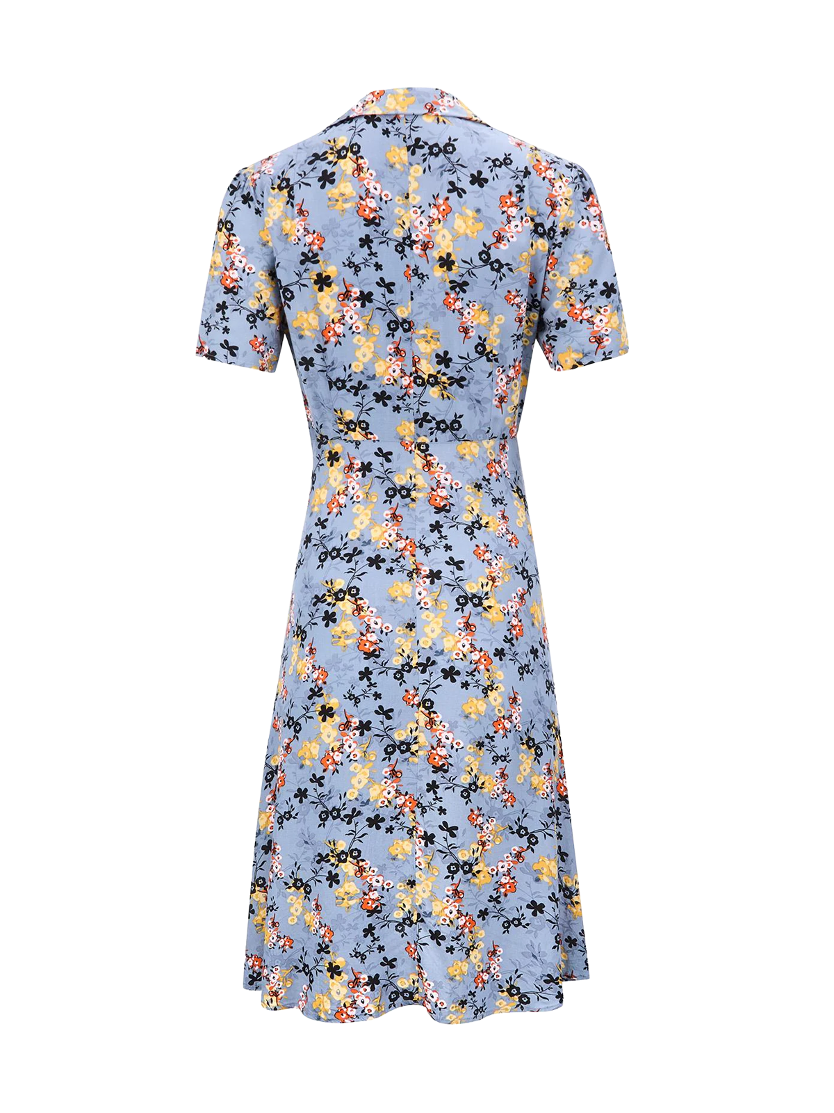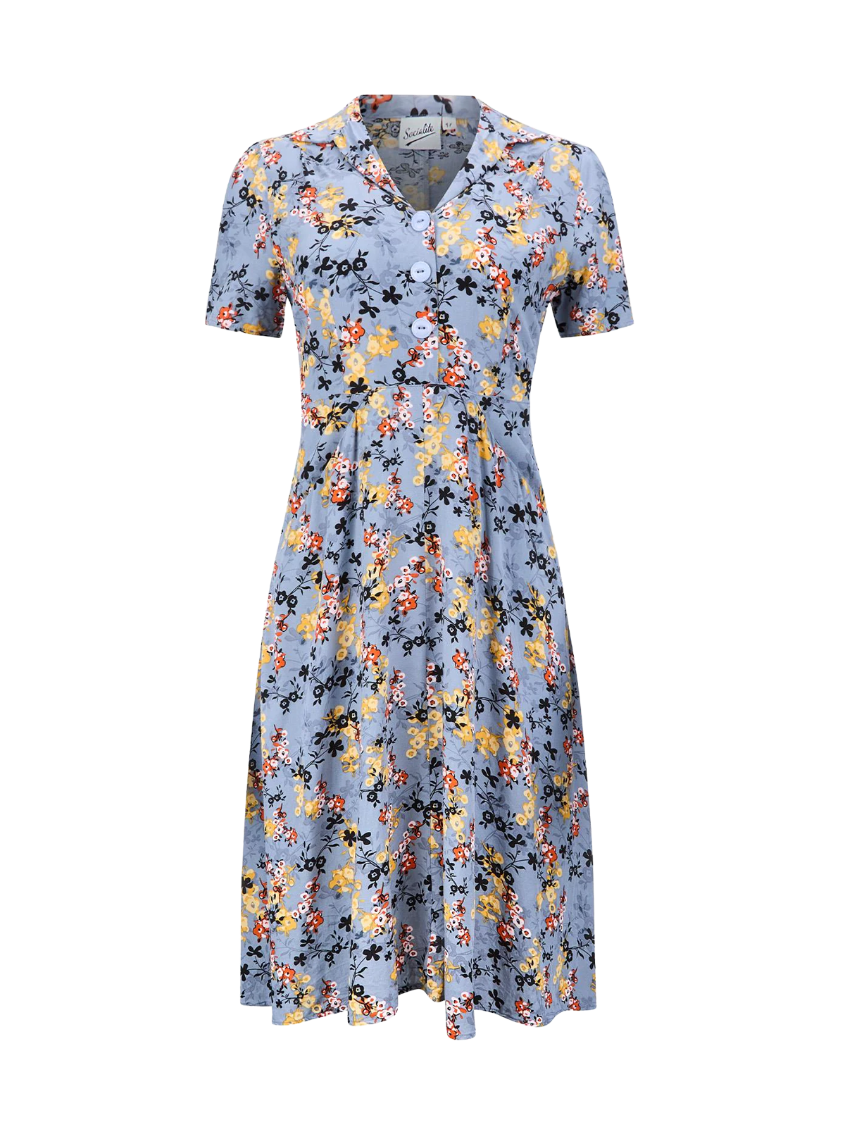 The Melody dress is a striking forties look shirtwaister style, replicated from an original vintage garment, right down to the smallest details like the three large feature buttons on the bodice. Made from a lightweight grey and yellow floral 100% Rayon fabric.