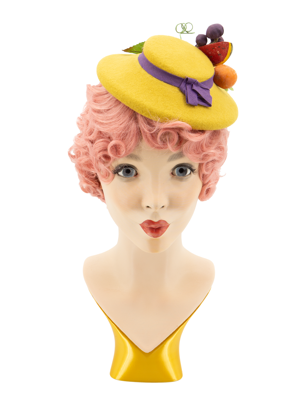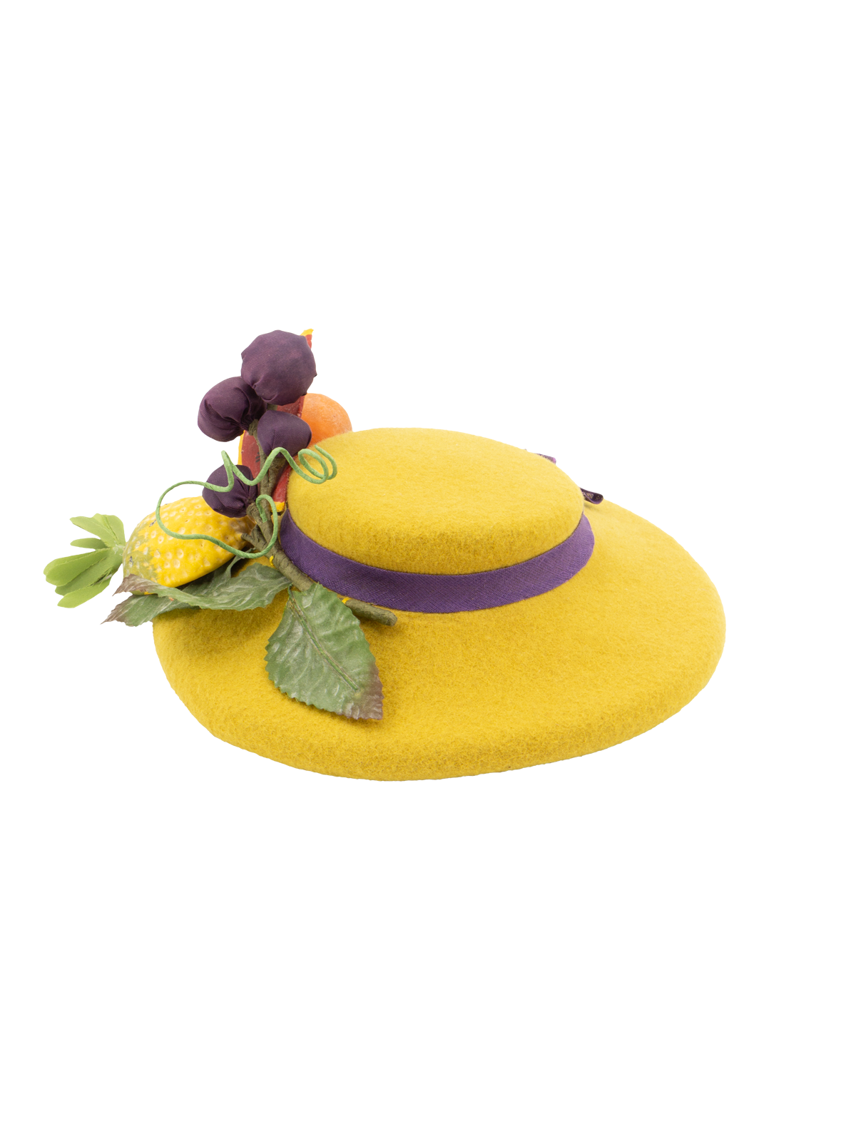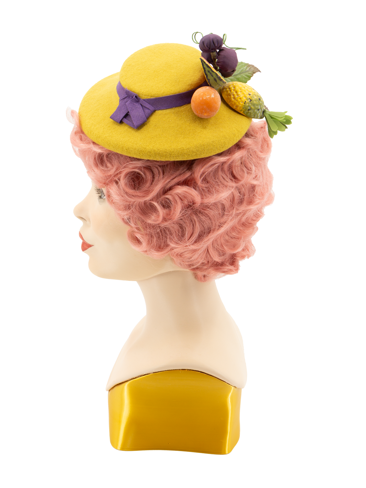 Quirky small felt hat decorated with vintage faux fruit, designed to be worn to one side.