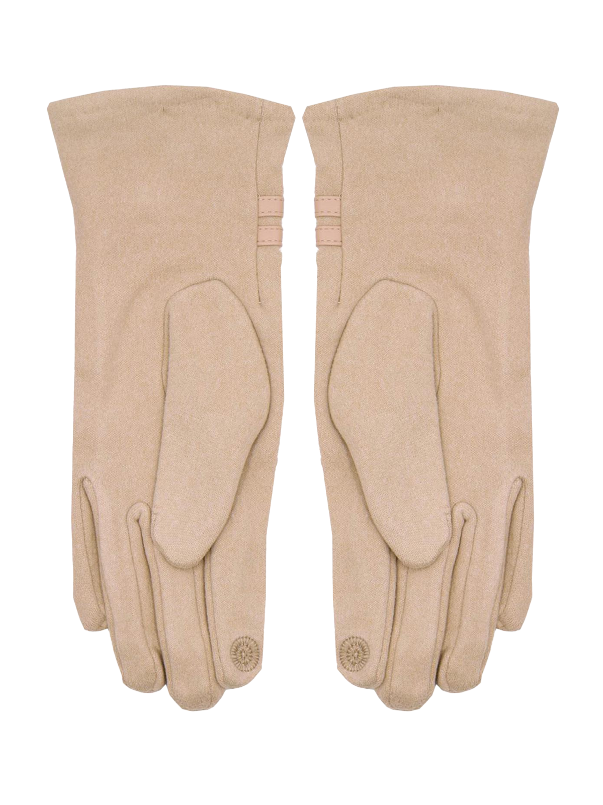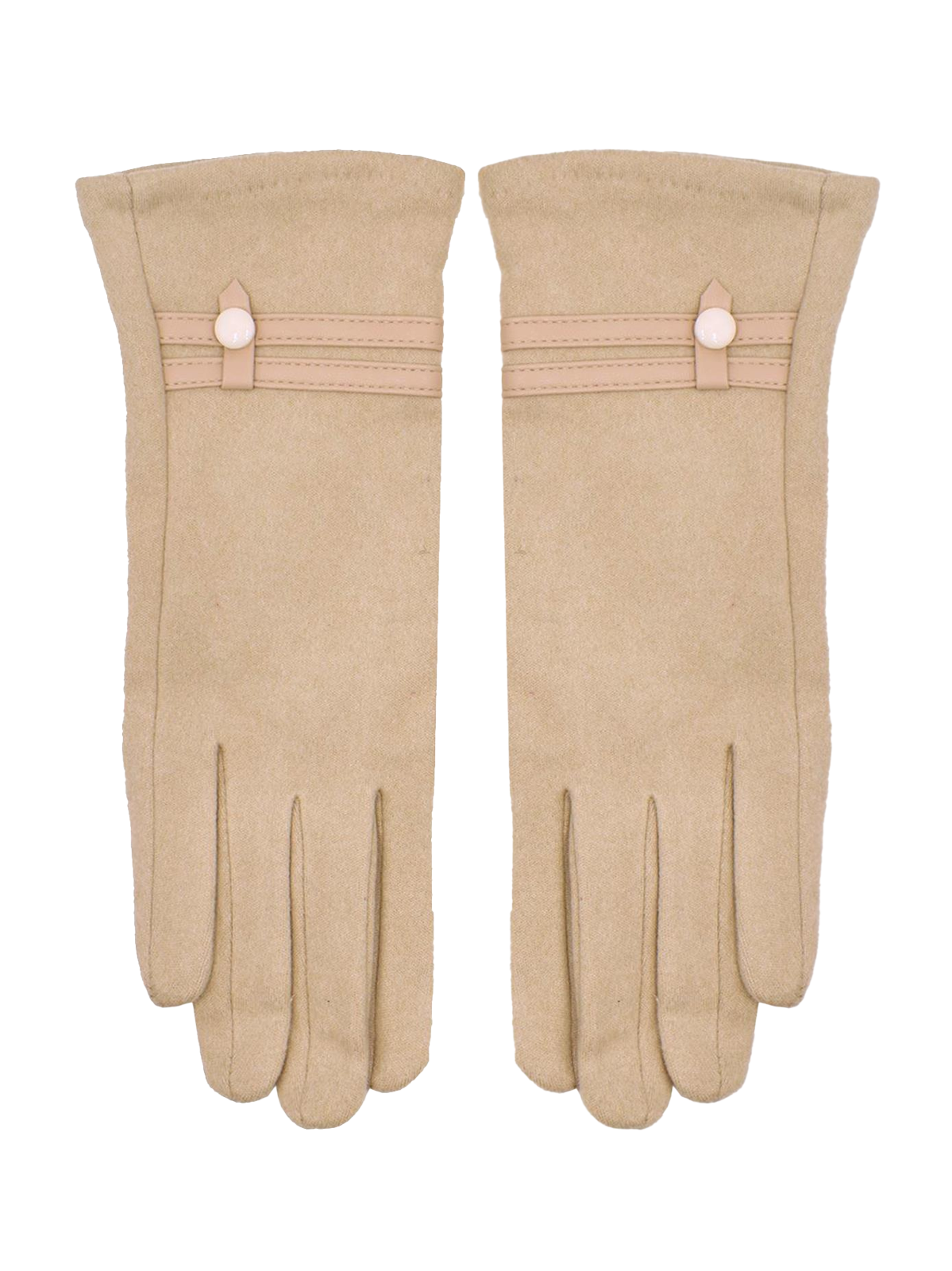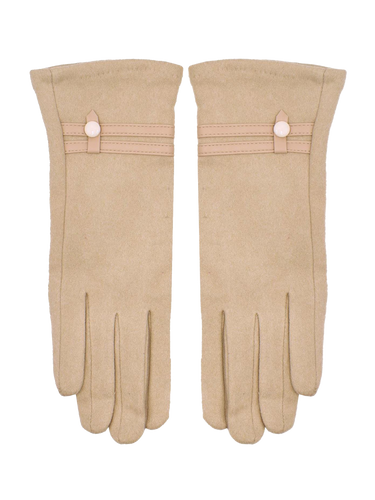 These classic and elegant ladies' beige gloves are designed for wear in colder weather. They are made from a finely knitted synthetic fabric and feature two faux leather straps with a decorative button on each wrist. The gloves include touchscreen pads on the forefinger and thumb, allowing you to operate your devices even with your gloves on. Their vintage look makes them a versatile accessory for 40s, 50s, and 60s outfits.