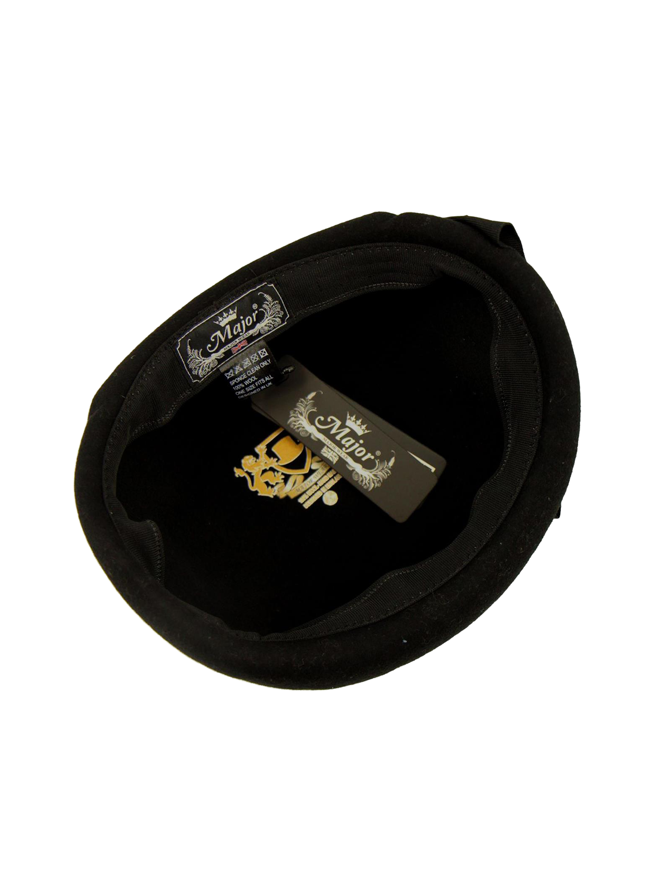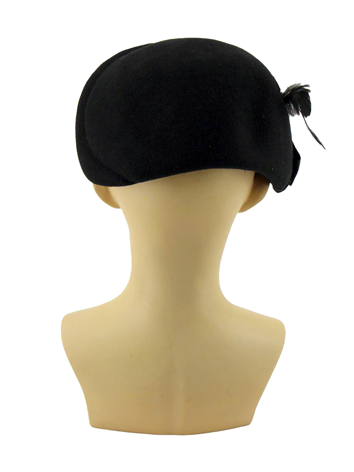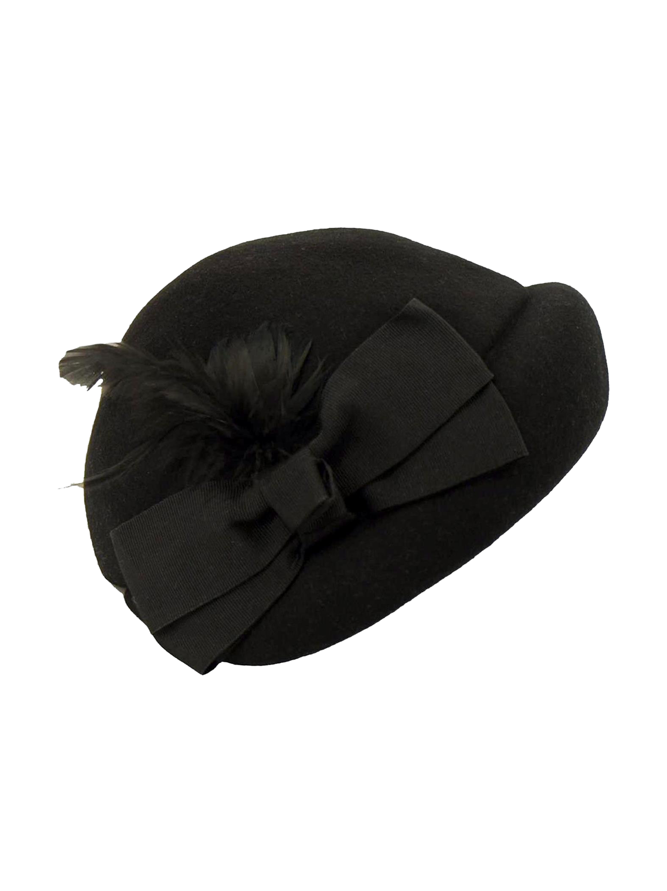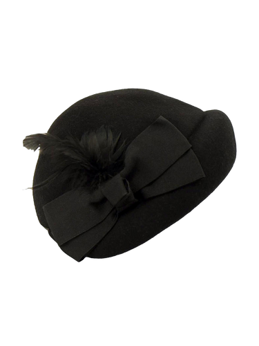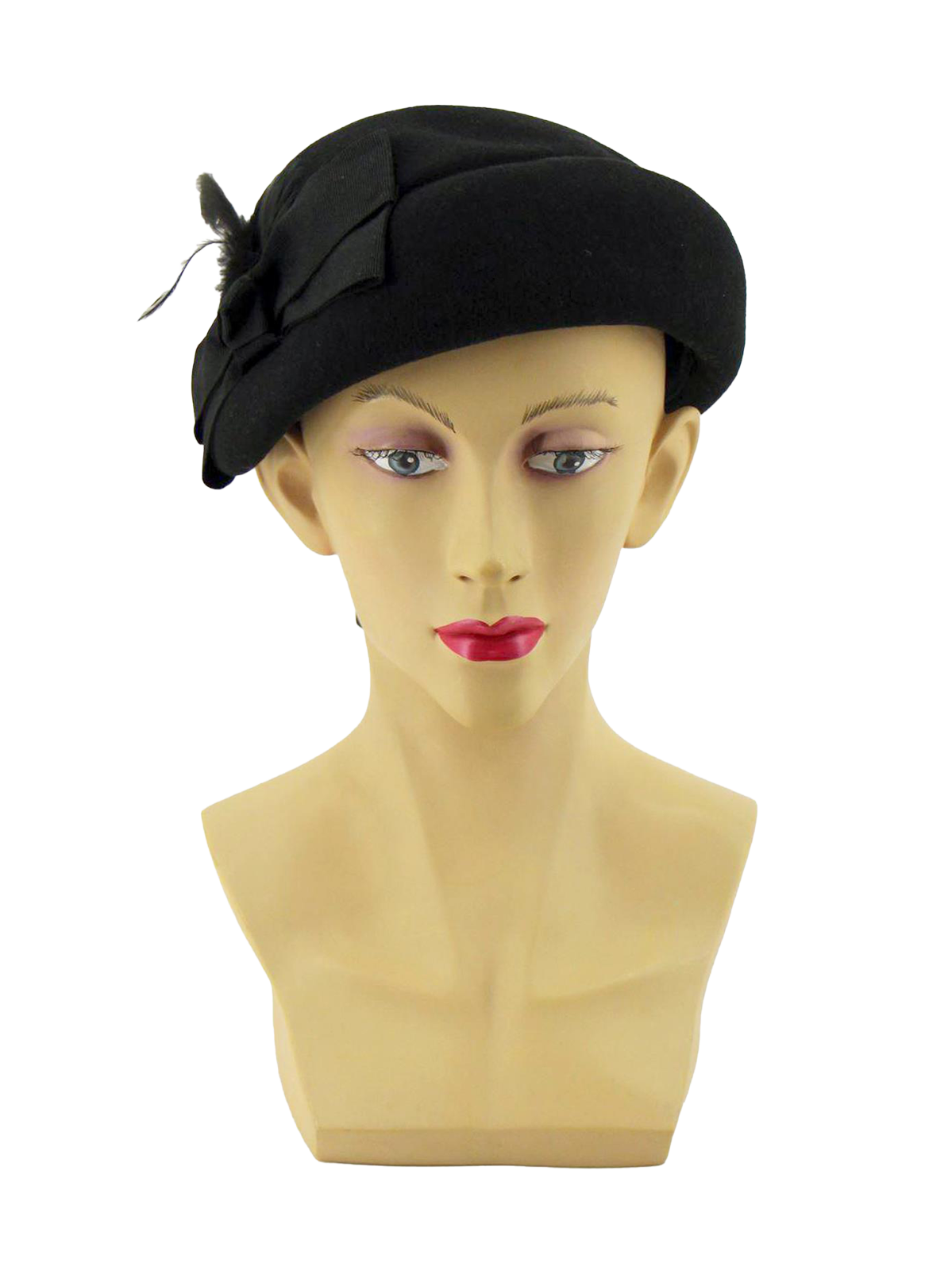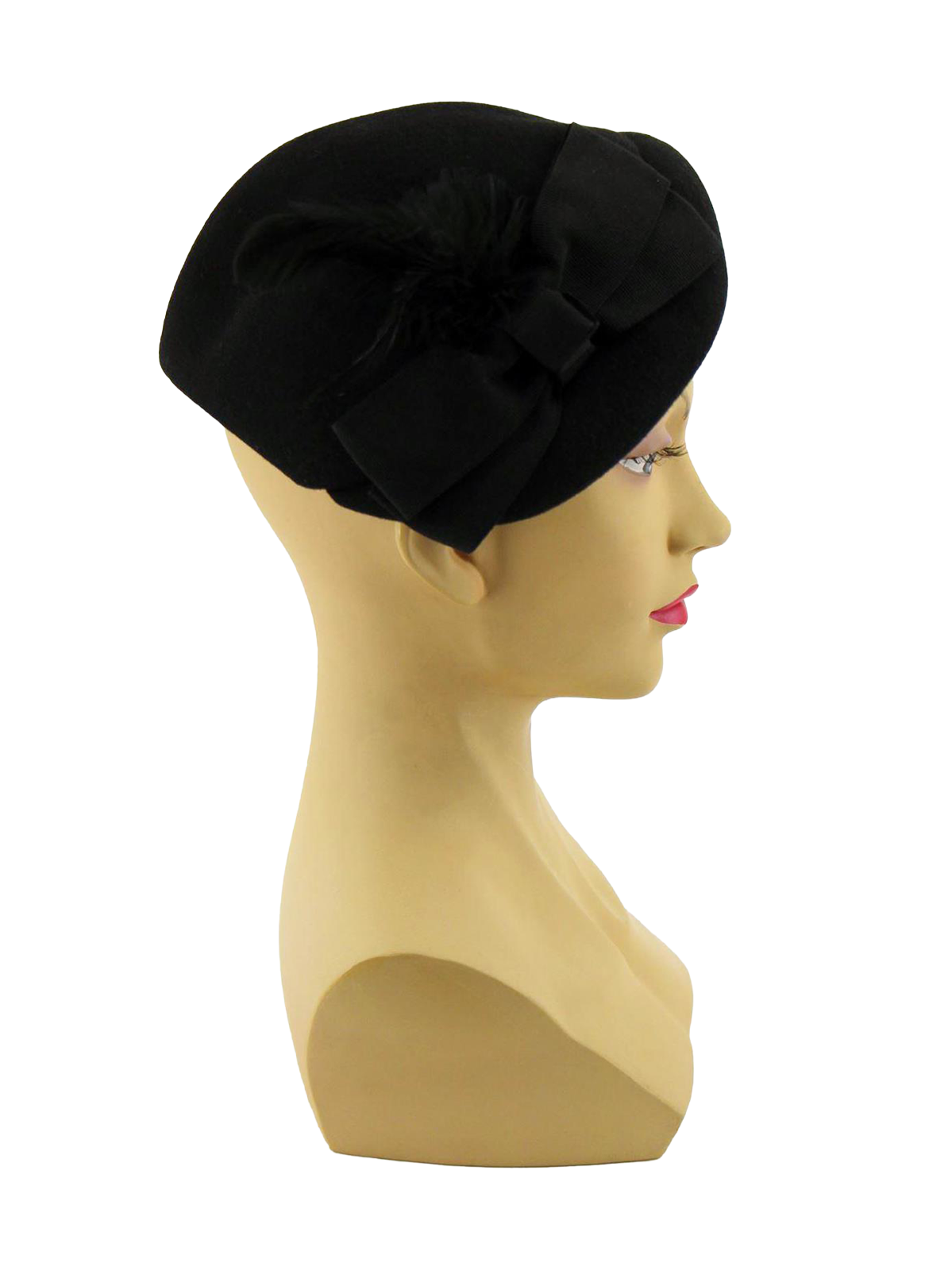 A vintage inspired 1940s half (casque) hat in dark red 100% wool felt. Trimmed to one side with a large grosgrain knotted bow and three black feathers, this sweet little design closely mirrors authentic forties styles. Finished with a water resistant coating and adjustable internal drawstring ribbons for a secure fit.