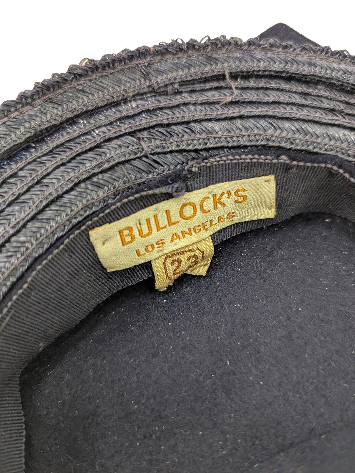 An adorable small ladies’ hat in dark blue with a shallow felt crown and felt bow trim. Designed with a back strap to hold it securely in place, this authentic piece captures the style of early WW2 fashions. Labelled Bullocks, Los Angeles. In fabulous condition aside from some makeup staining to the internal hatband at the front, not visible when worn.