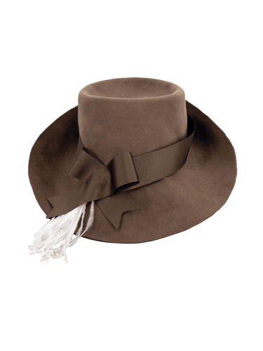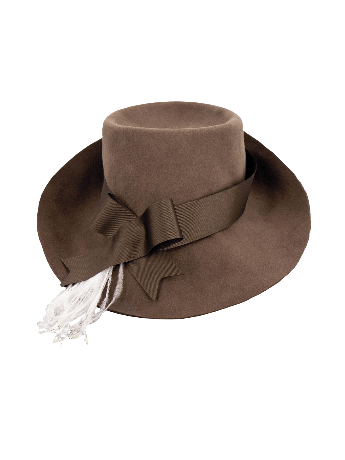 This style is a ladies' 1940s felt trilby tilt hat in a versatile light brown colour, with appealing feather decor and a Petersham hatband featuring a cute bow. The trilby is shaped to sit nice and low on the head to complete a glamorous and authentic forties look. A period-accurate and stylish reproduction accessory that will add flair to your outfit, perfect for events or casual outings.