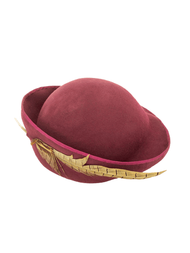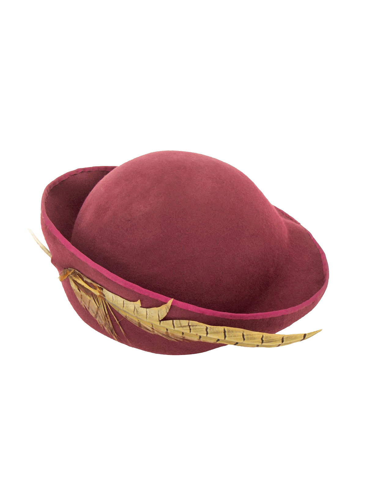 Part of the exclusive Lilegance for Socialite collection, this handmade vintage replica hat is inspired by 1940s millinery halo designs. Made in the UK by independent hatmaker Lilegance, it is crafted from 100% wool felt in a striking rich burgundy red shade. The design features a deep upturned brim and a single feather decoration. The flattering halo shape is designed to beautifully complement the face and hair. This period accurate accessory is a guaranteed standout piece for any 1940s-inspired ensemble, perfect for events or everyday wear.