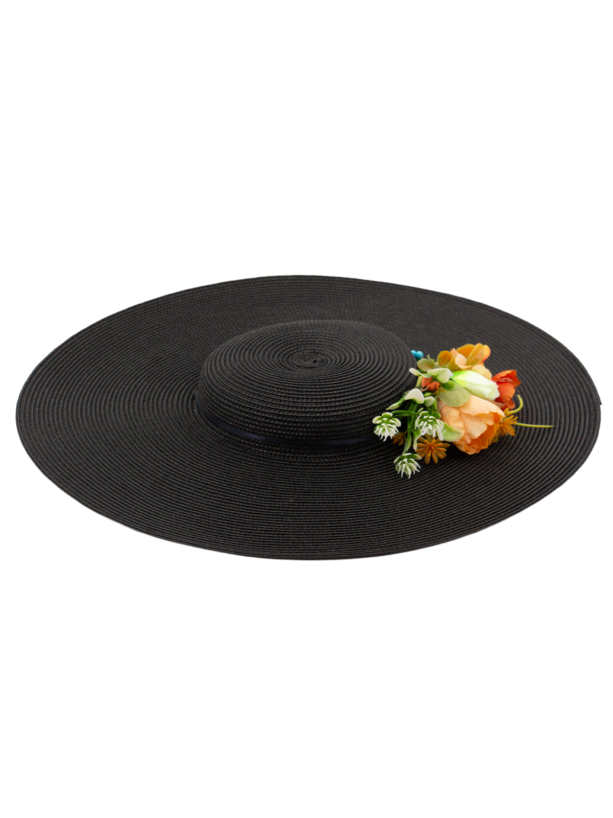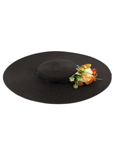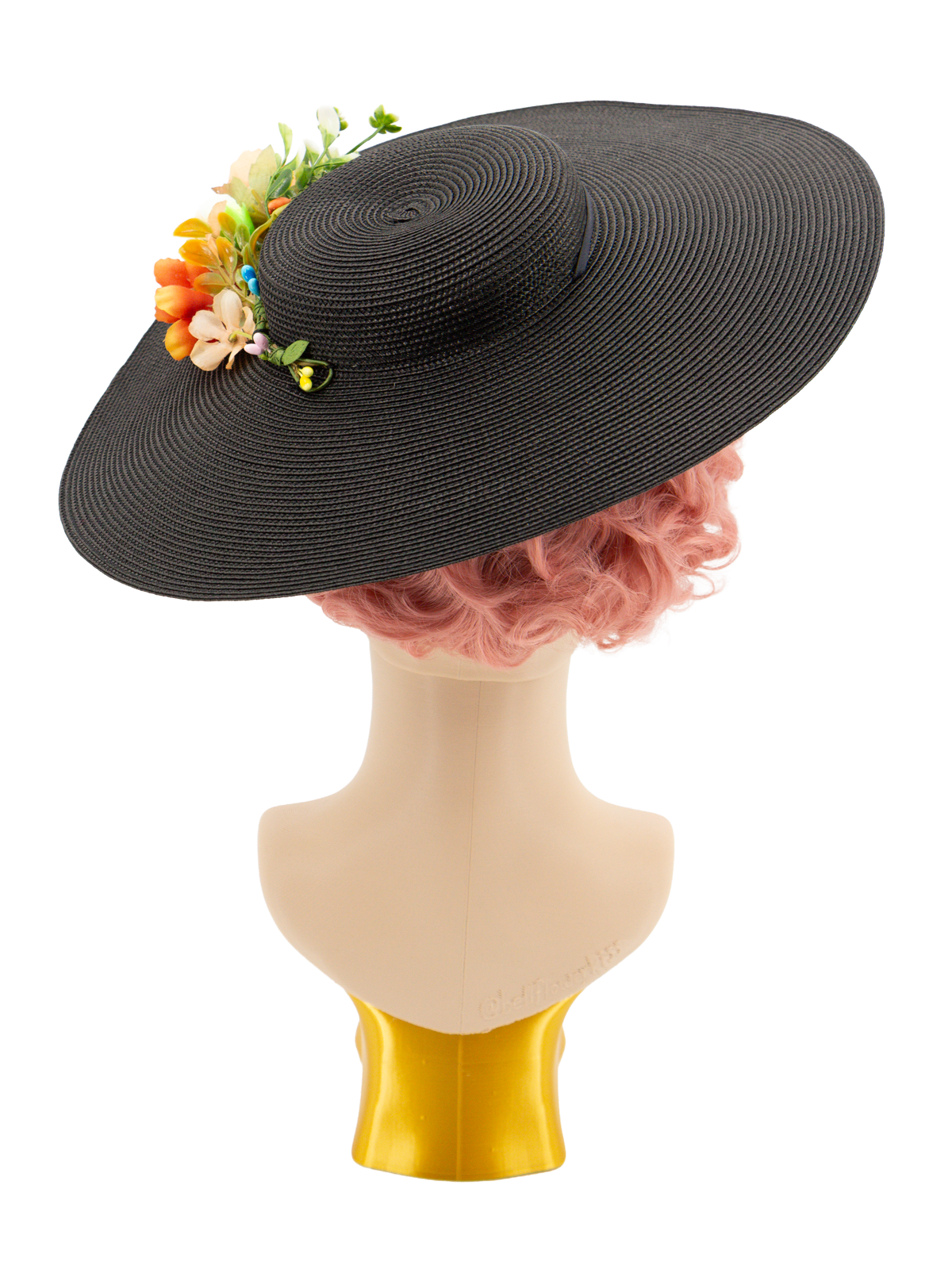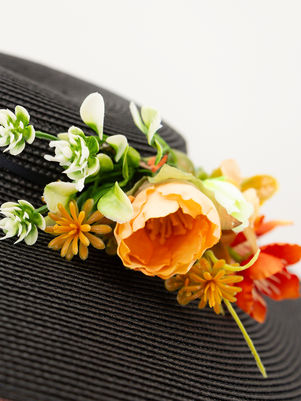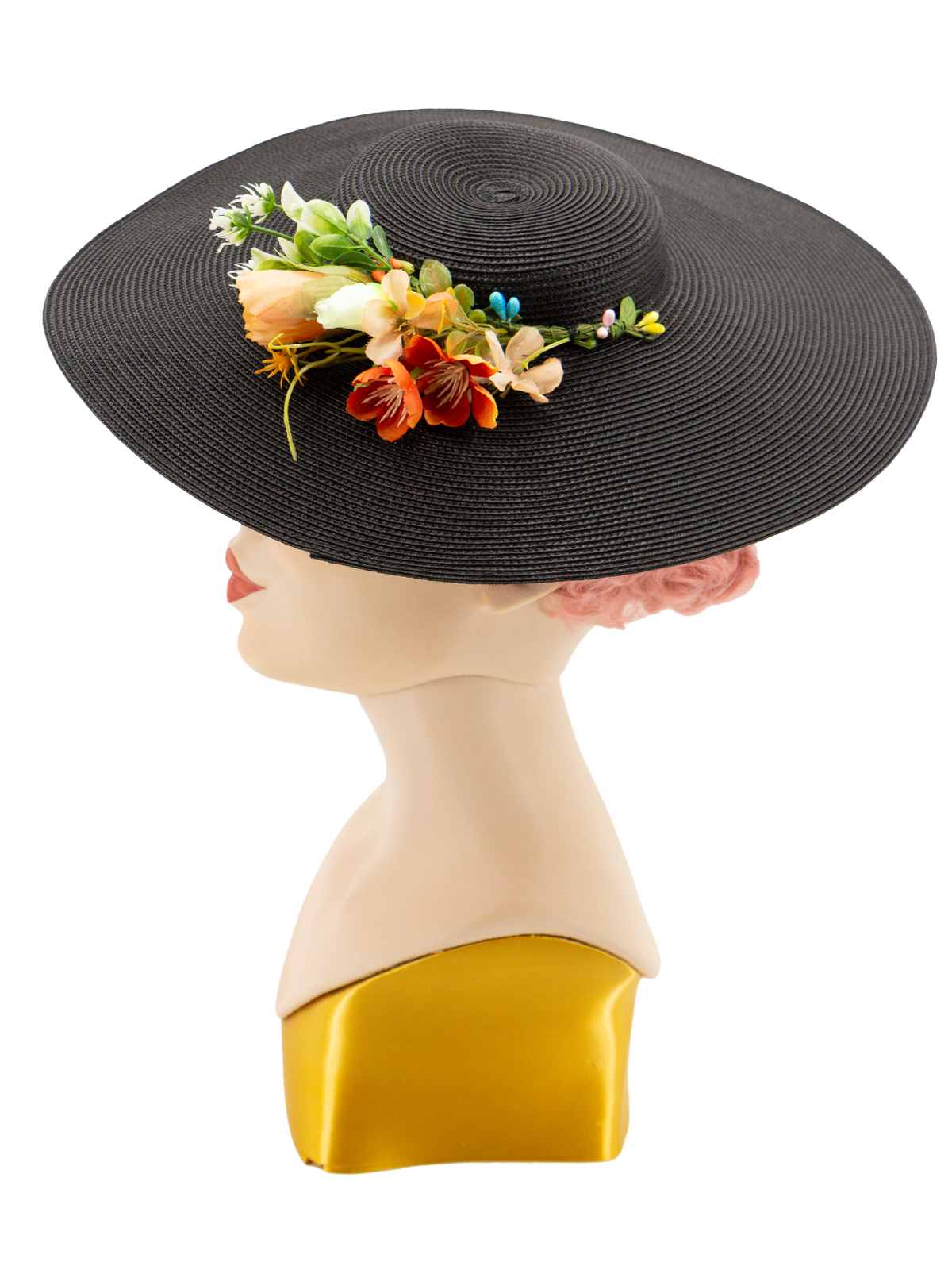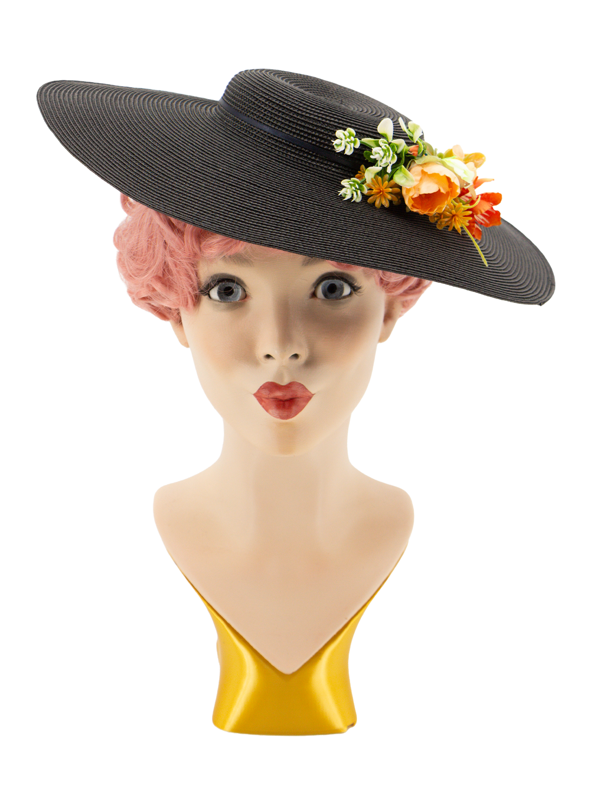 Woven in classic black, it has a wide brim and shallow crown, adorned with spring faux flowers, in peach, white and burnt orange. Tilt as you desire to create a demure film noir appearance. The shape of this hat won't vary, but the trims are antique or vintage therefore may have minor differences. This also ensures you are buying something unique.