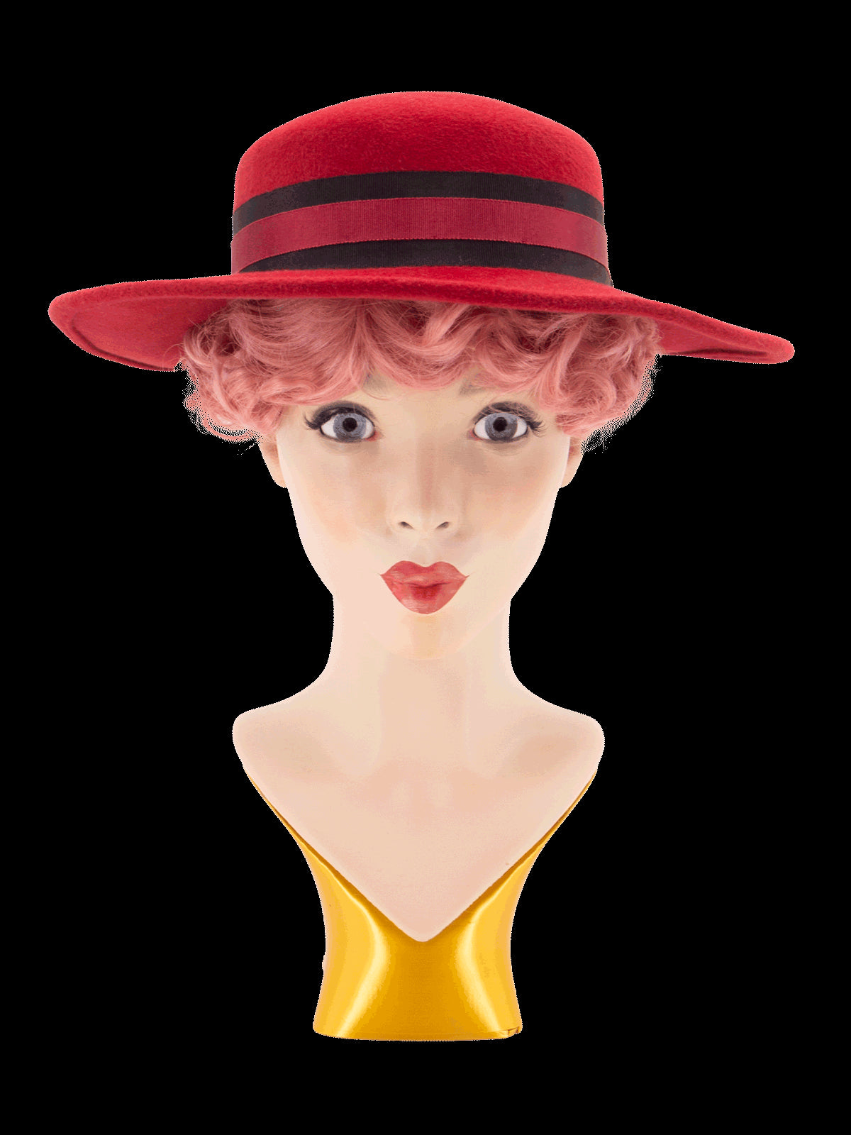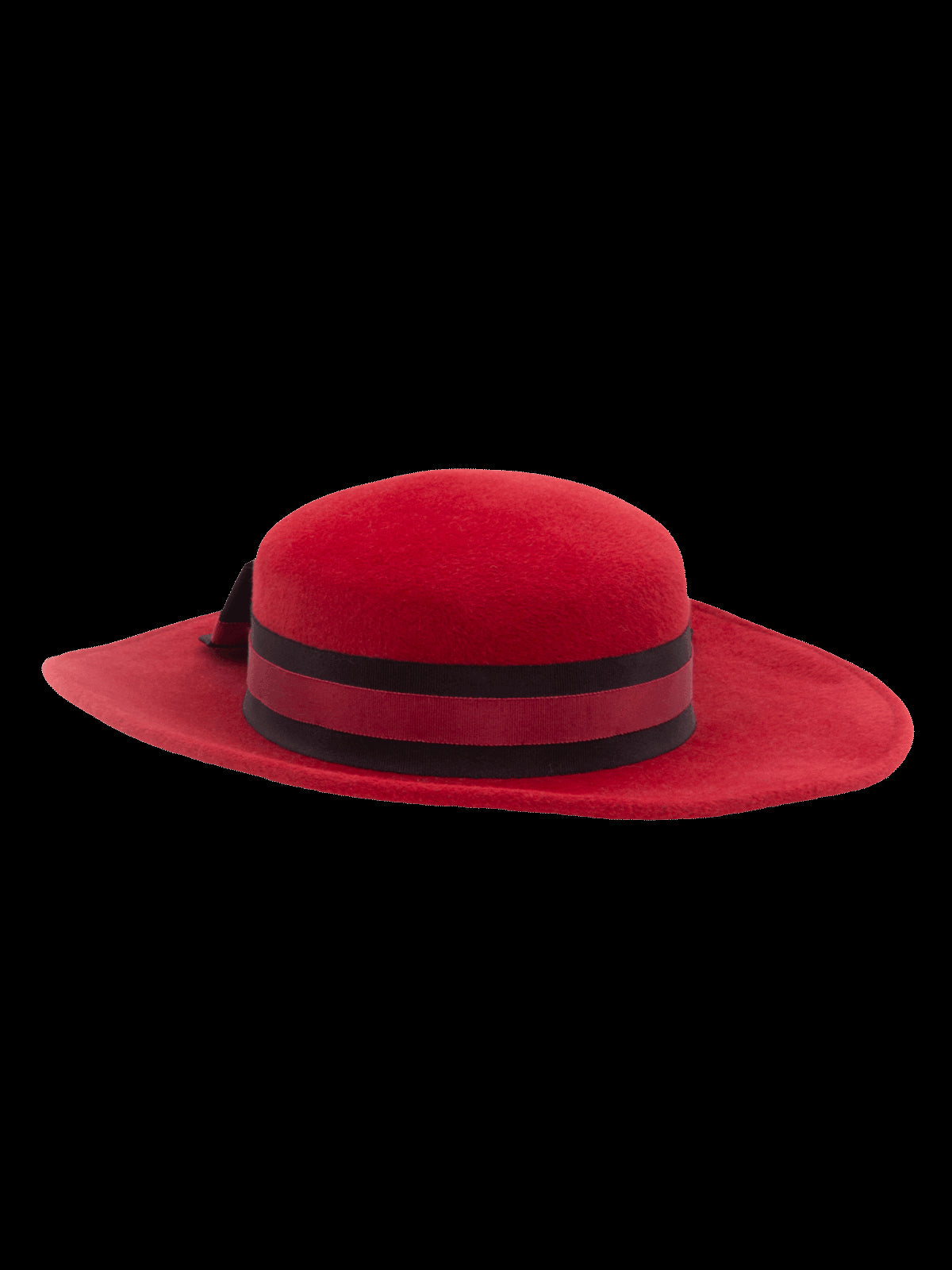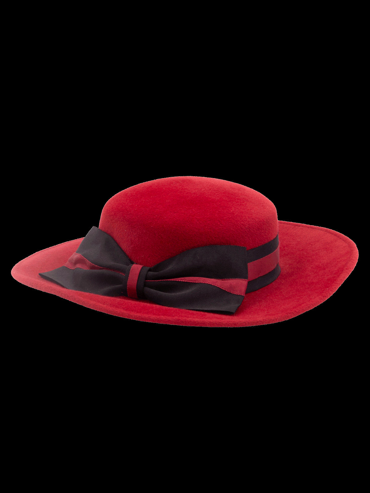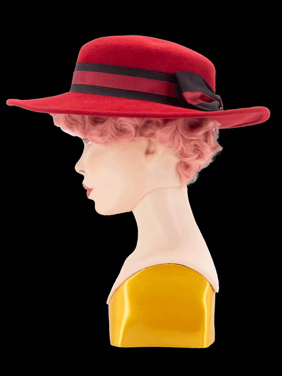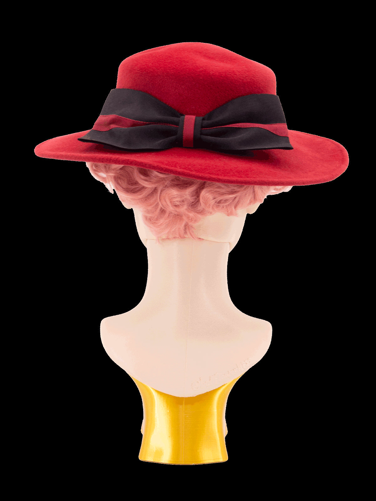 True vintage medium brim hat in a ruby red wool felt. This classic style features a contrast black grosgrain ribbon around the crown and bow detail at the back. A 1980s hat, that when styled at an angle has the look of earlier styles.
