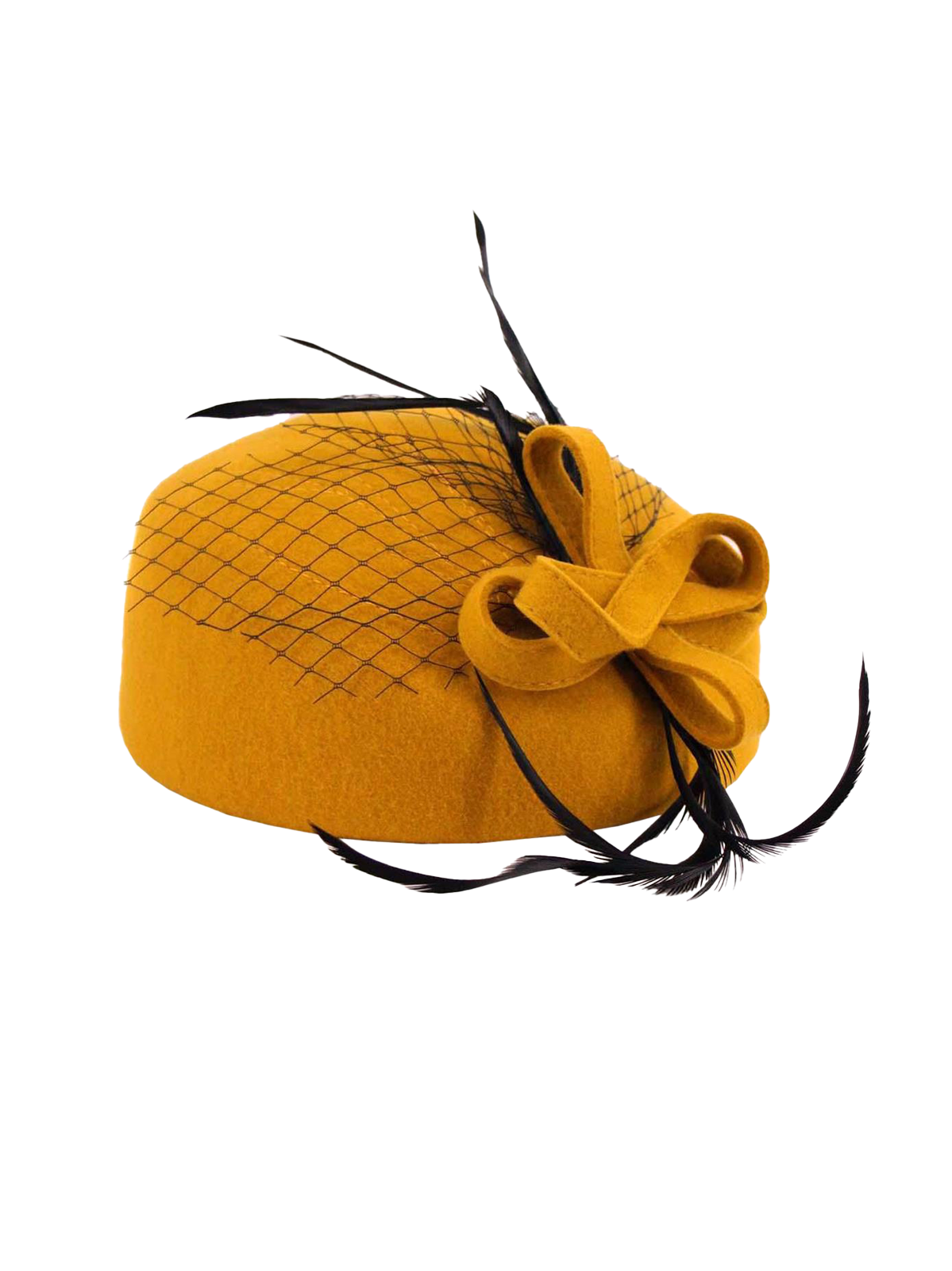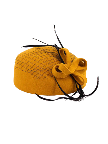 Add a touch of vintage drama with this forties-style deep pillbox hat in a vibrant mustard hue. Elegantly adorned with multi-loop detailing, black feather, and net trims, it’s the perfect statement piece to complete your retro-inspired ensemble. Crafted from 100% wool felt with a water-resistant finish, this hat balances timeless style with everyday practicality.