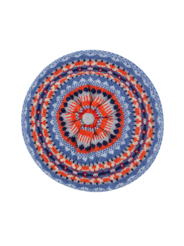 Vintage style wool beret, in a forties style with a bright Fairisle pattern featuring tonal blues and greys with vibrant orange and red highlights.