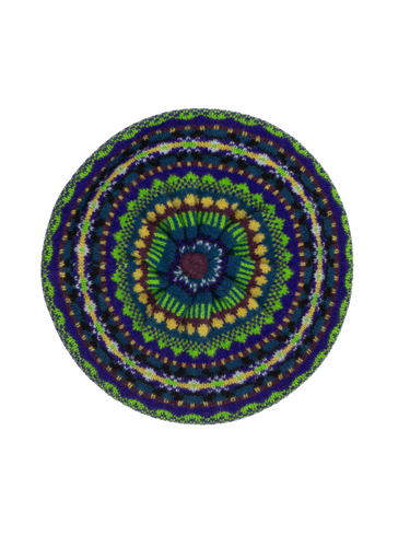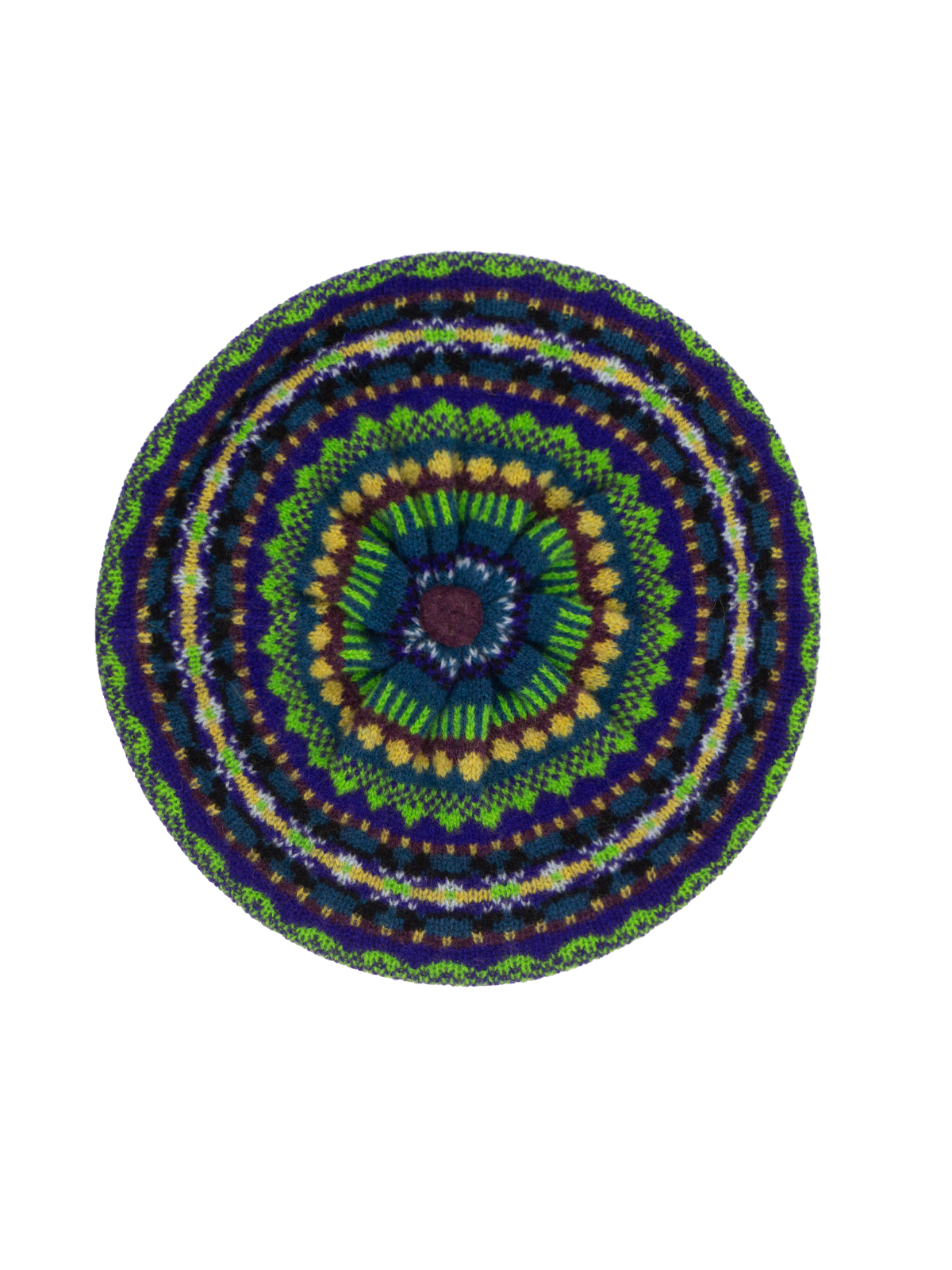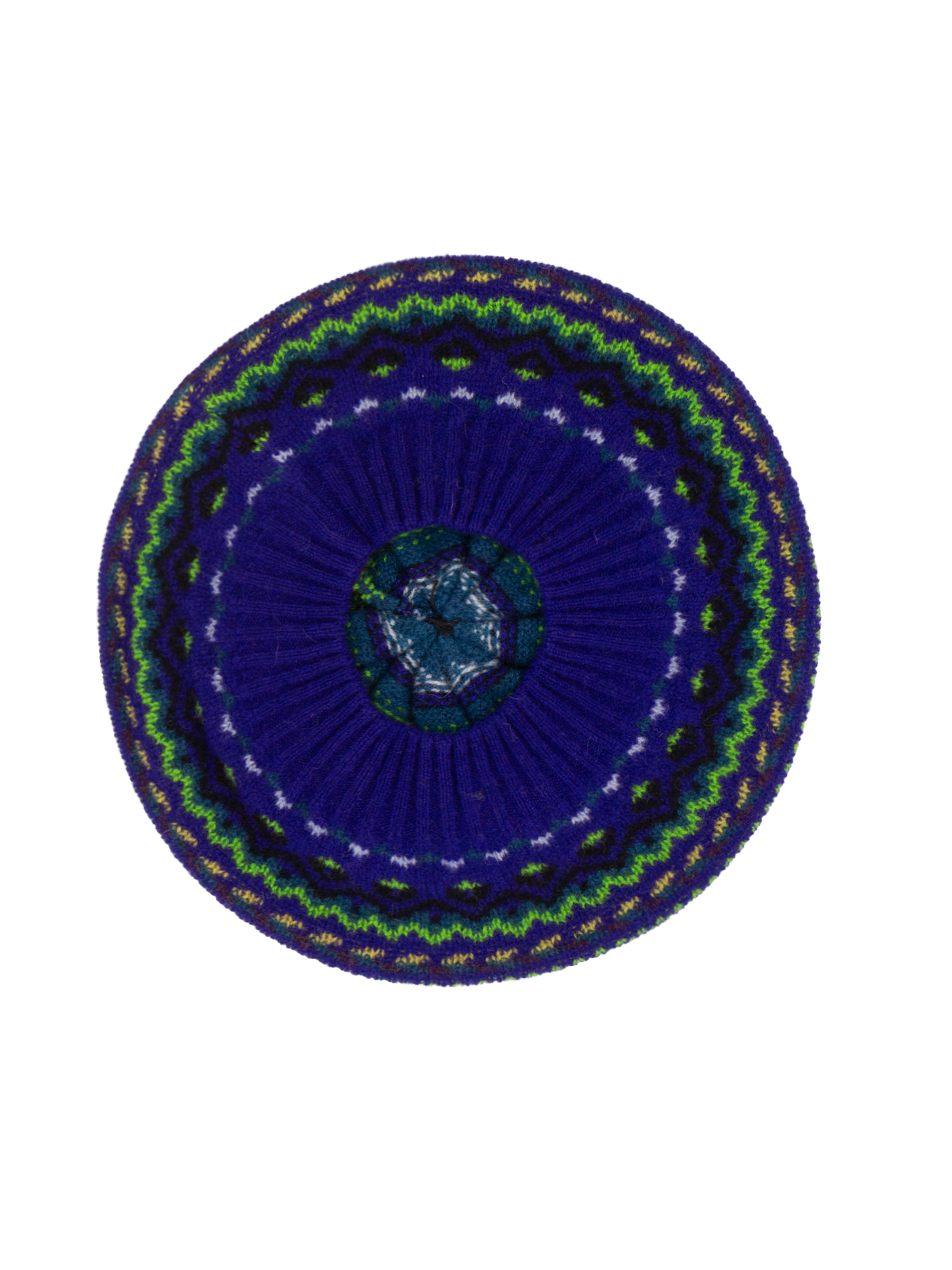 Vintage style wool beret, in a forties style with a bright Fairisle pattern featuring flashes of teal blue, purple, yellow and lime green.