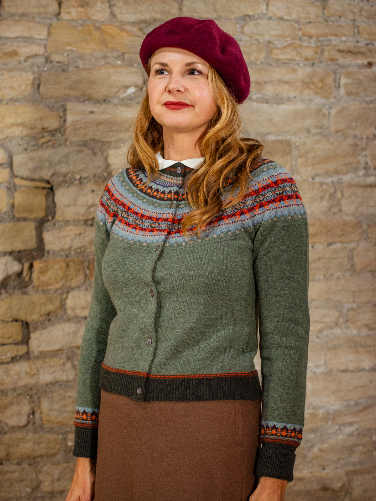 This high quality, hand produced knit cardigan features a bright Fairisle pattern and has the same charm as an original from the 1940s.