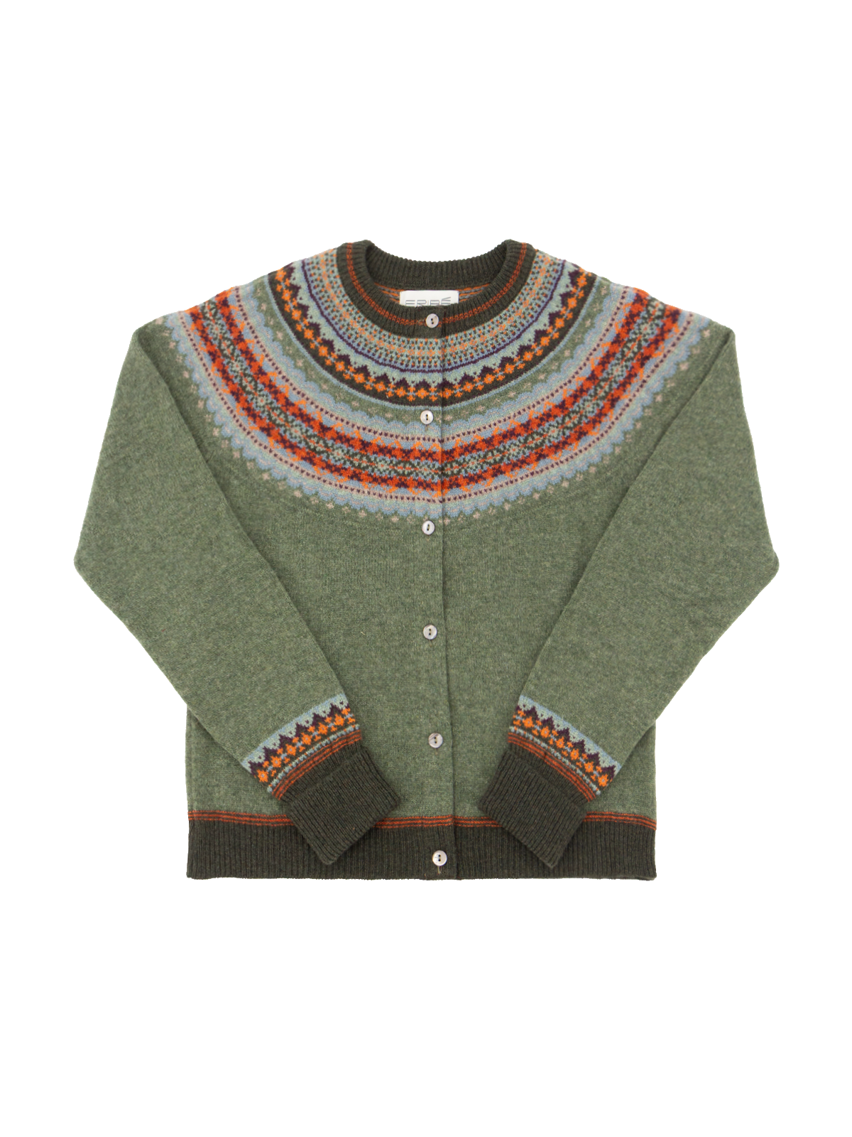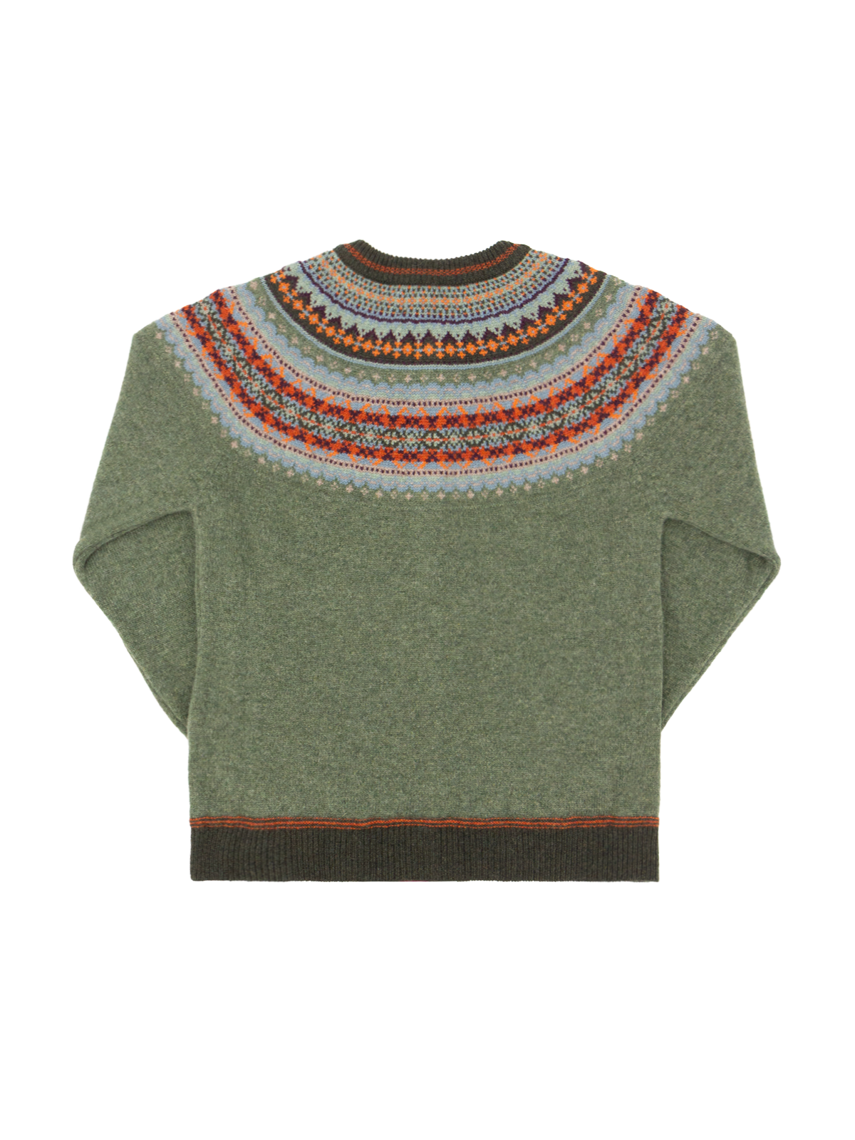 The Braemar colourway is a flecked sage green, with fairisle detail in sky blue, forest green, orange, grey and purple.