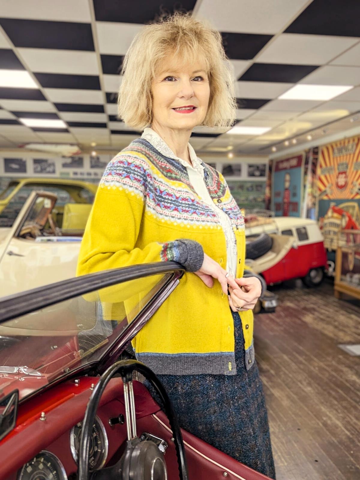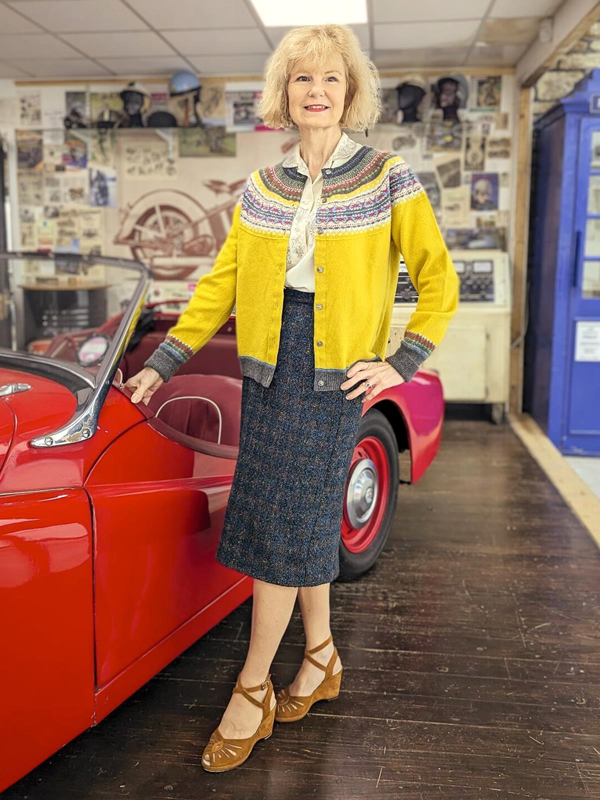 This high quality, hand produced knit cardigan features a bright Fairisle pattern and has the same charm as an original from the 1940s.
