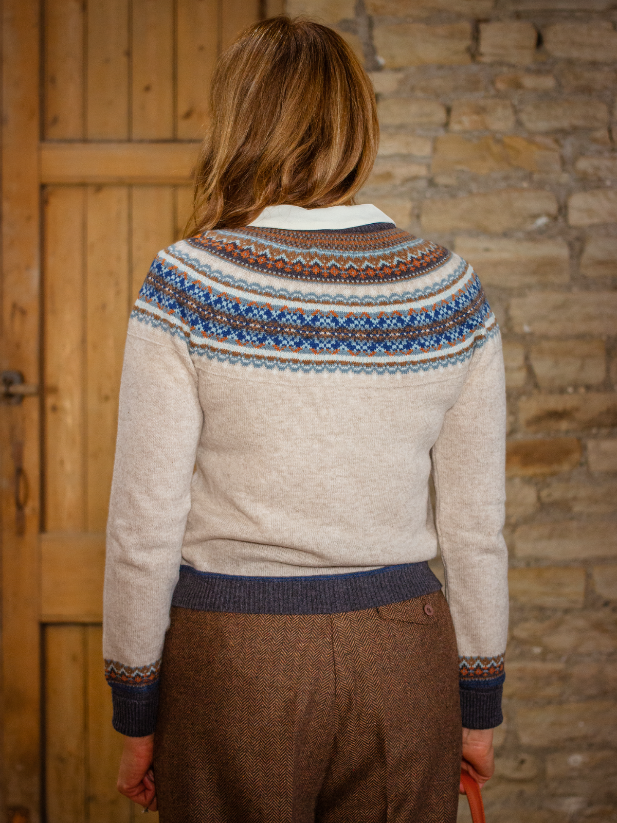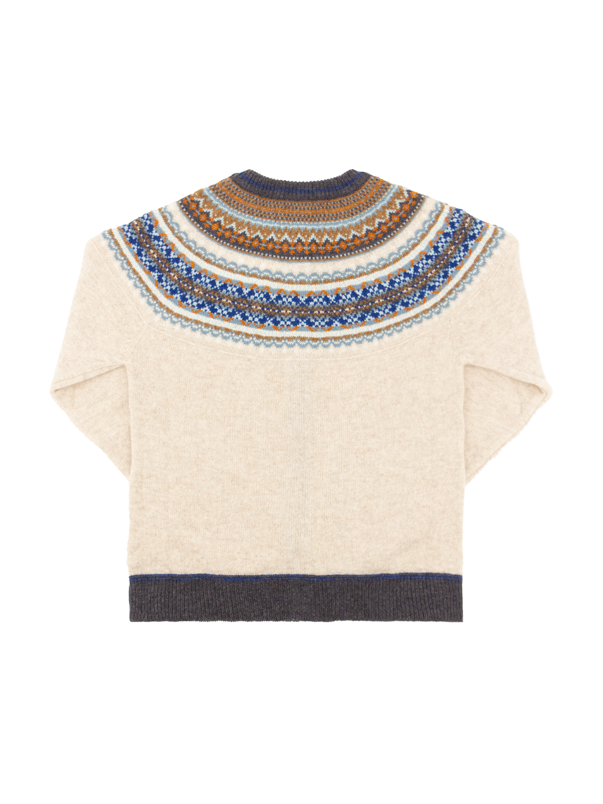 The Taurus colourway is a flecked cream-beige, with fairisle detail in tonal blues, orange, brown and grey.
