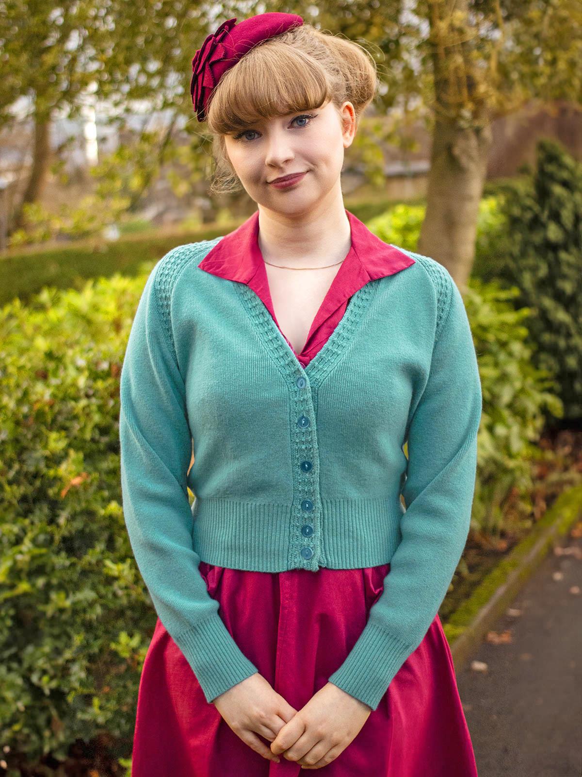 The Daydream cardigan's shorter length makes it a perfect match for vintage dresses or high-waisted jeans, enhancing any 1940s or 50s-inspired outfit, whether for a formal occasion or a casual day out.