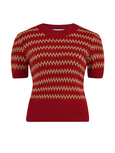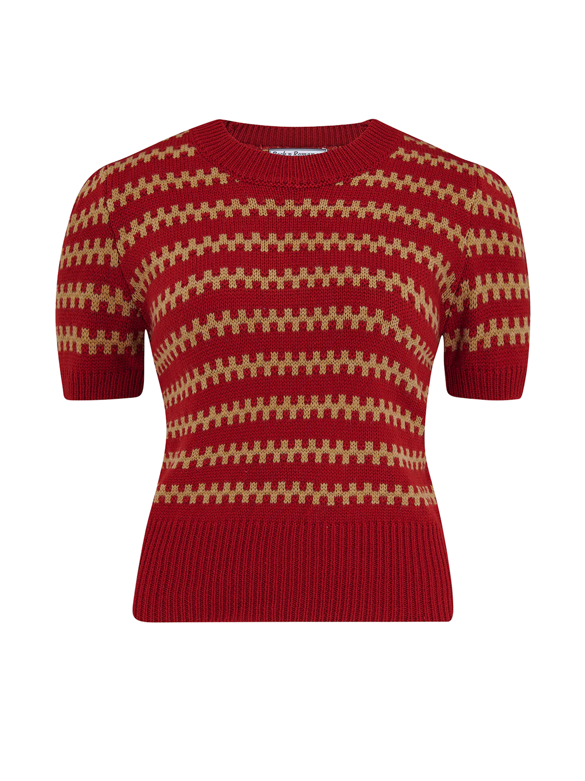 A classic red knit top, with stripe detail, perfect for 1940s and 50s inspired looks. Easy to style with jeans and flats for a relaxed outfit, or layer over vintage dresses. Pair with the matching cardigan to create a versatile twinset. Finished with small neck buttons for easy wear without disturbing your hairstyle.