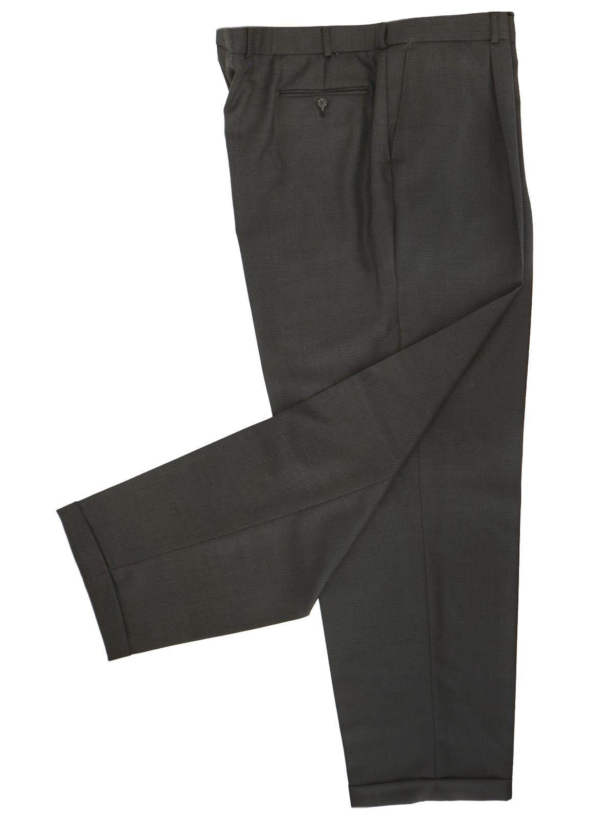 The matching trousers have twin pleats at the front and turn-up cuffs. Two slanted side pockets and a bound pocket with a button at the back.