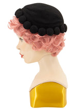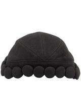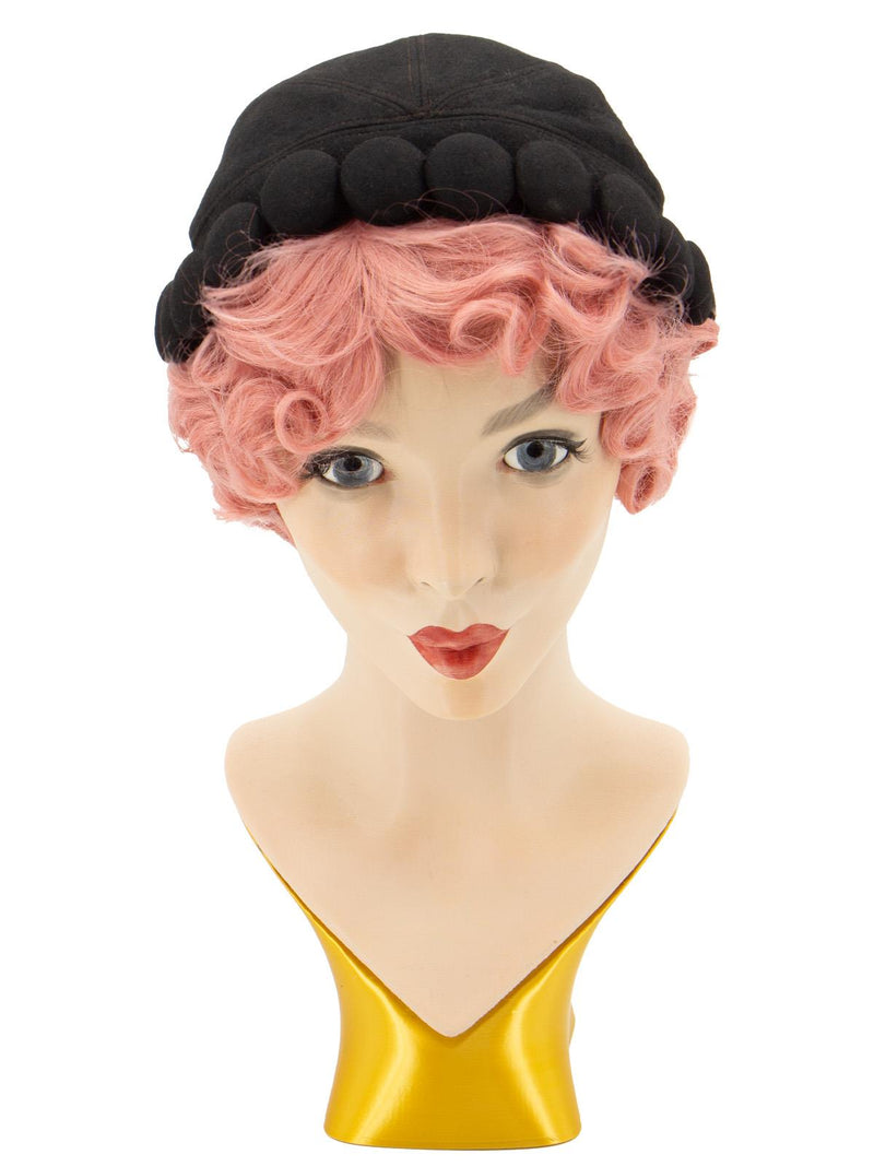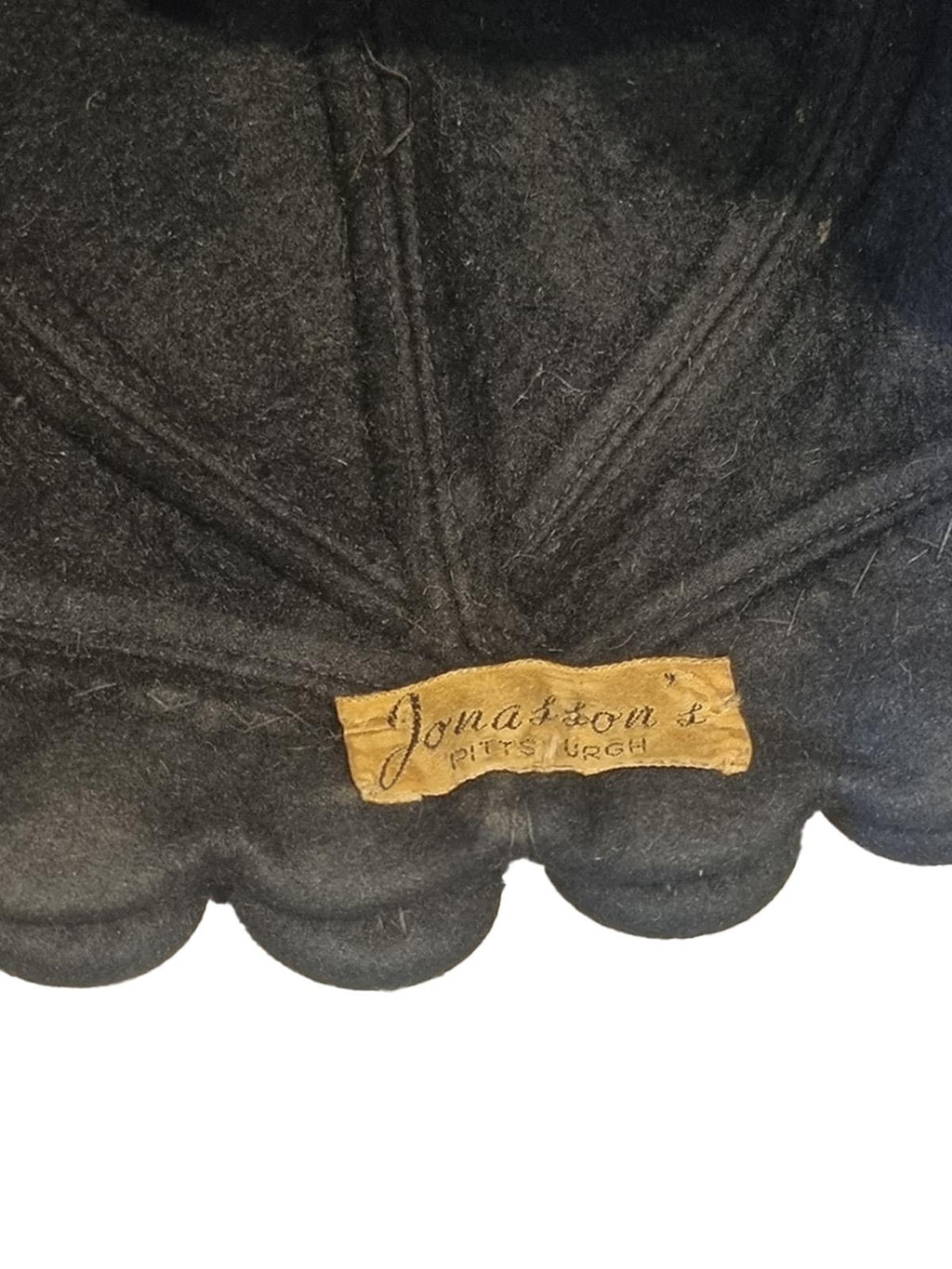 An elegant 1940s curvette hat in black felt, featuring button like decoration around the full edge. The panelled structure is highlighted with double top stitching, making it a neat and easy-to-wear accessory. A versatile midcentury piece that coordinates effortlessly with clothing from the same era. Labelled Jonasson, Pittsburgh.
