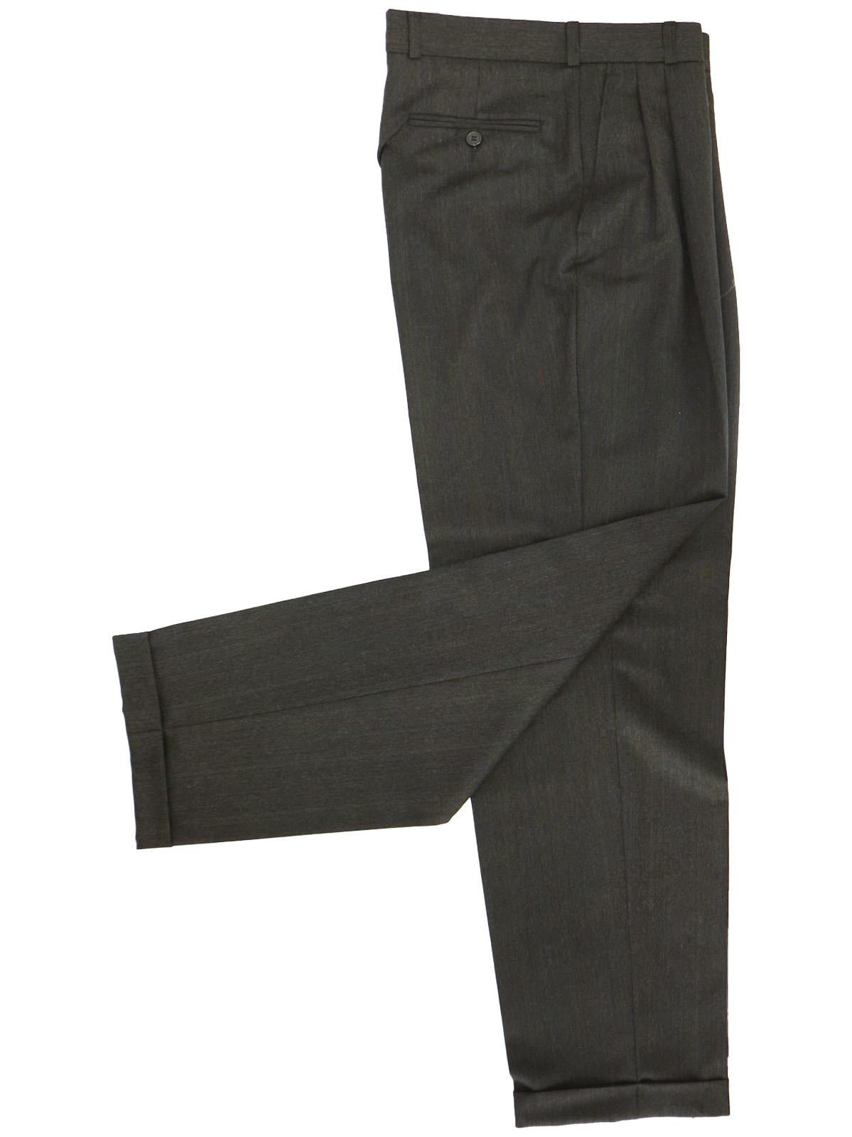 The matching trousers have pleated fronts and turn-up cuffs. Two side pockets and one bound pocket with button at the back.
