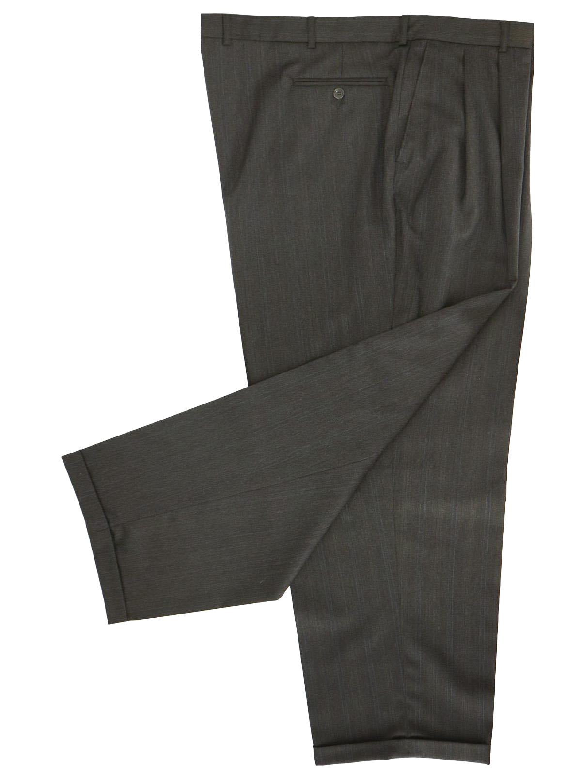 The matching trousers have twin pleated fronts and turn-up hem cuffs. Two side pockets and two bound pockets at the back.