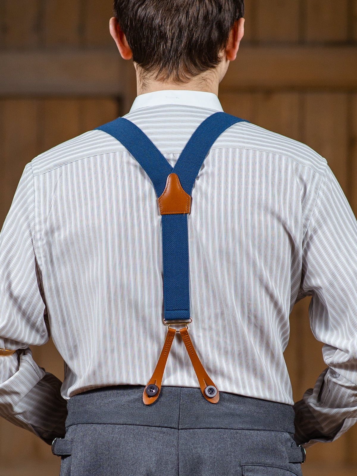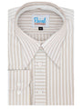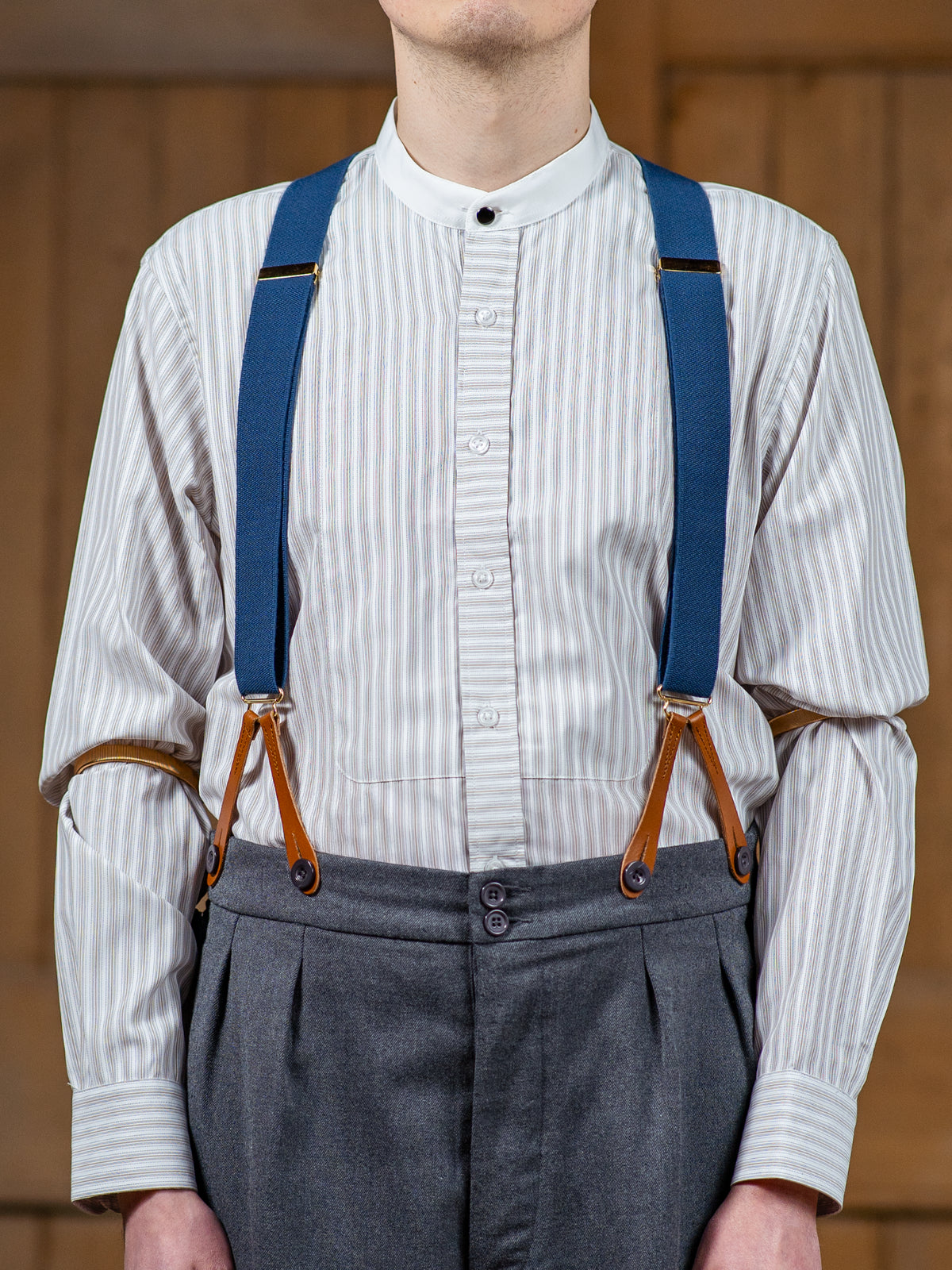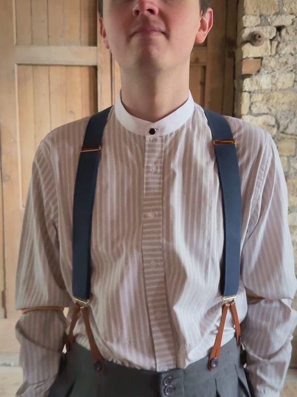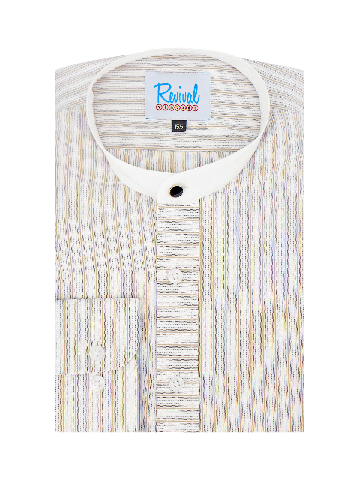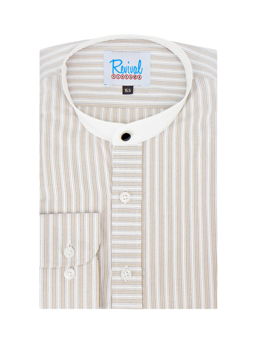 Our collarless shirt design is presented here with a Revival-exclusive stripe, in a traditional brown shade. This shirt features a stud at the collar to attach one of our detachable collars or to wear without for a more casual look. This classic "grandad" design collar is a staple for any vintage wardrobe which compliments a range of 1930s and 40s ensembles.
