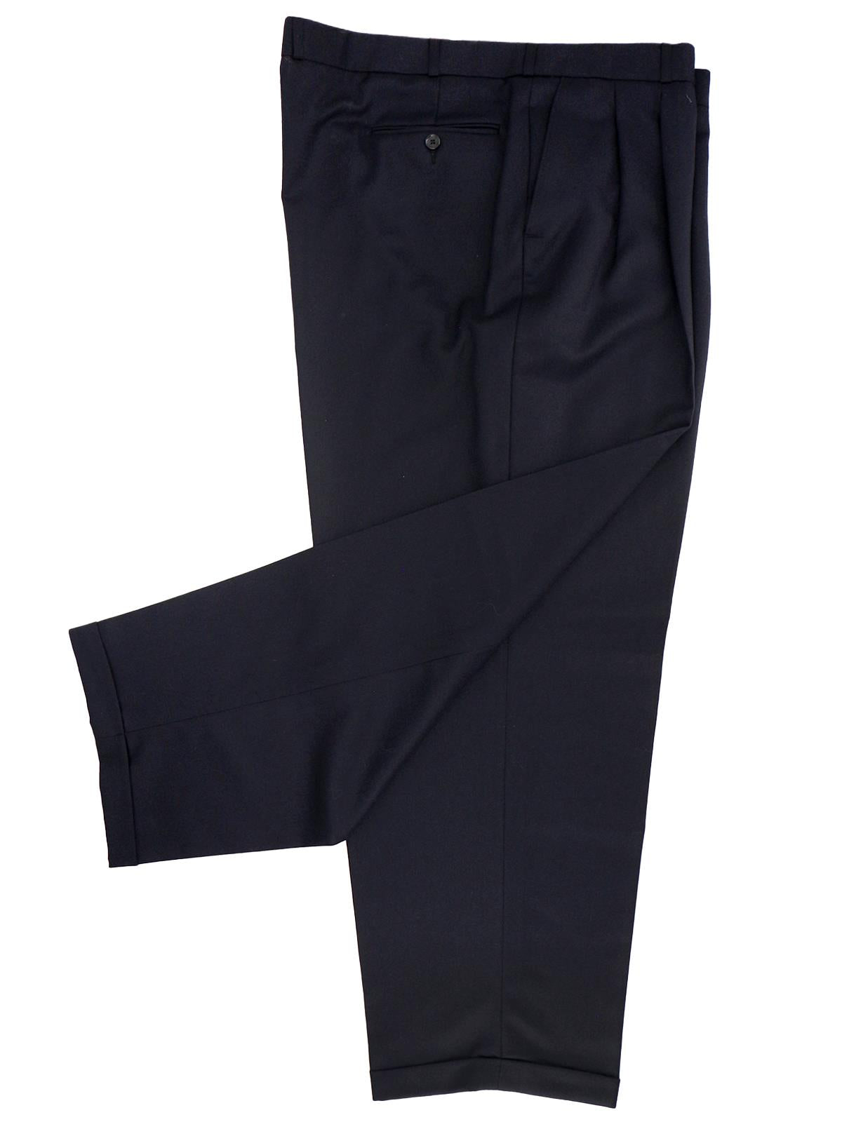 The matching trousers have double-pleated fronts and turn-up cuffs. Two side pockets and two bound back pockets.