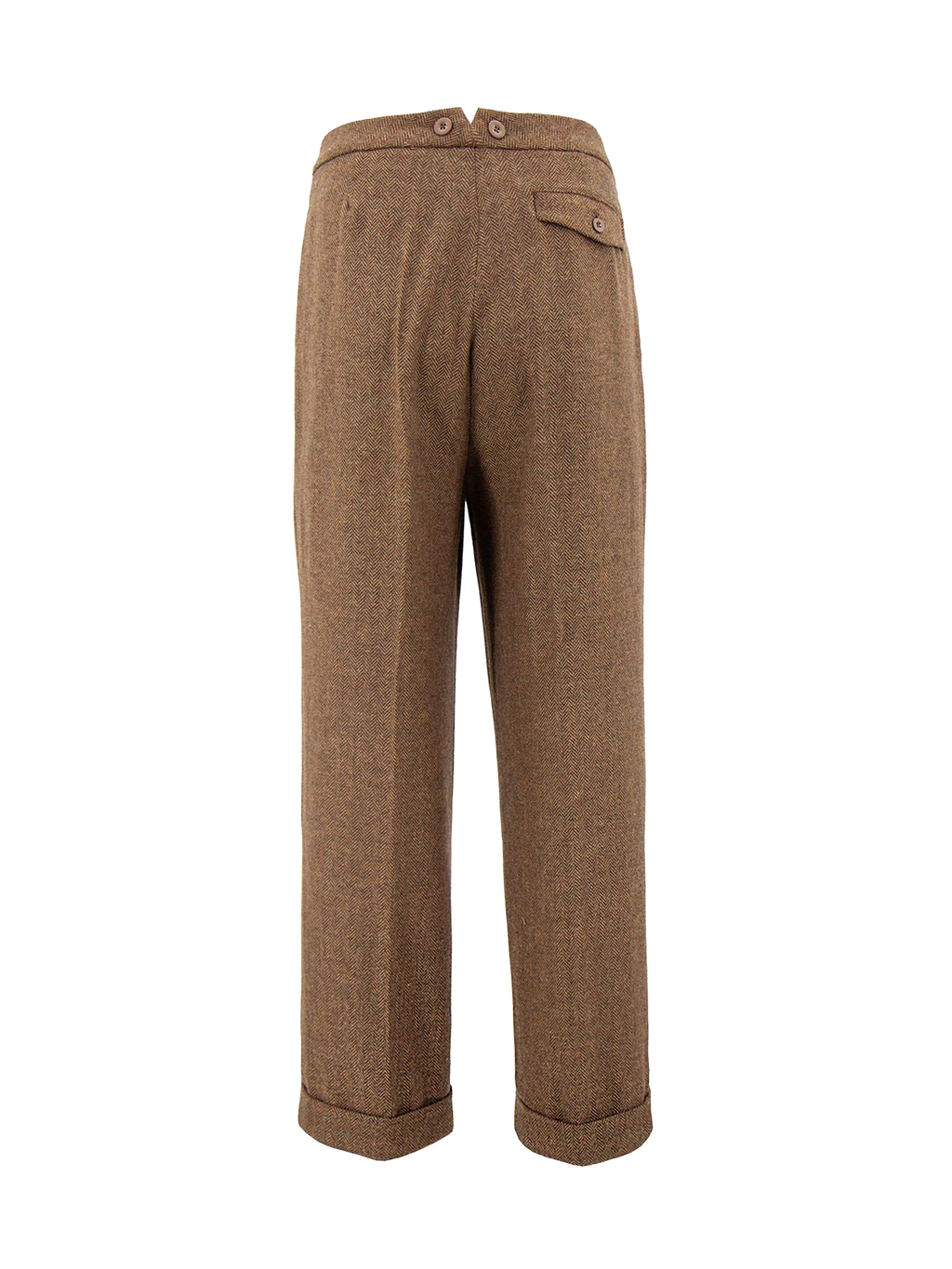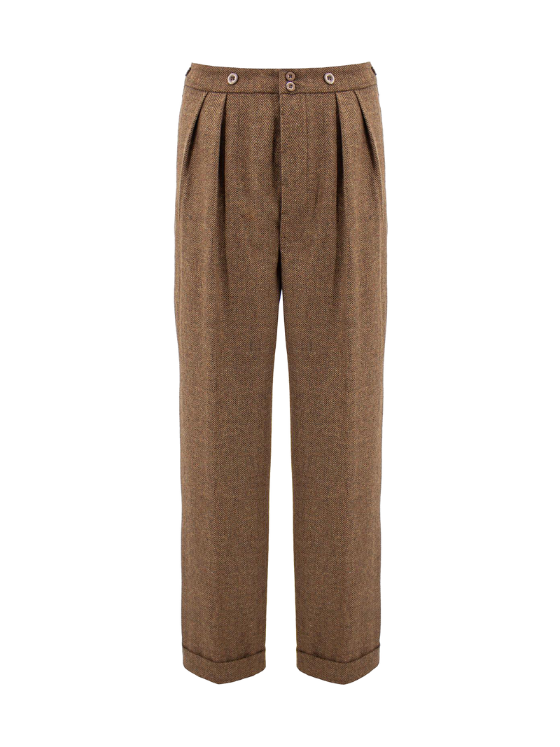 The Granville trousers are faithful replicas of an original 1930s pair, a more understated interpretation of the Oxford bag style that defined men’s fashion in the 1920s and 1930s. These high waisted trousers feature a period accurate V-notch at the back and are crafted from a soft, high quality light and dark brown herringbone cloth, echoing the refinement and comfort of true vintage tailoring.