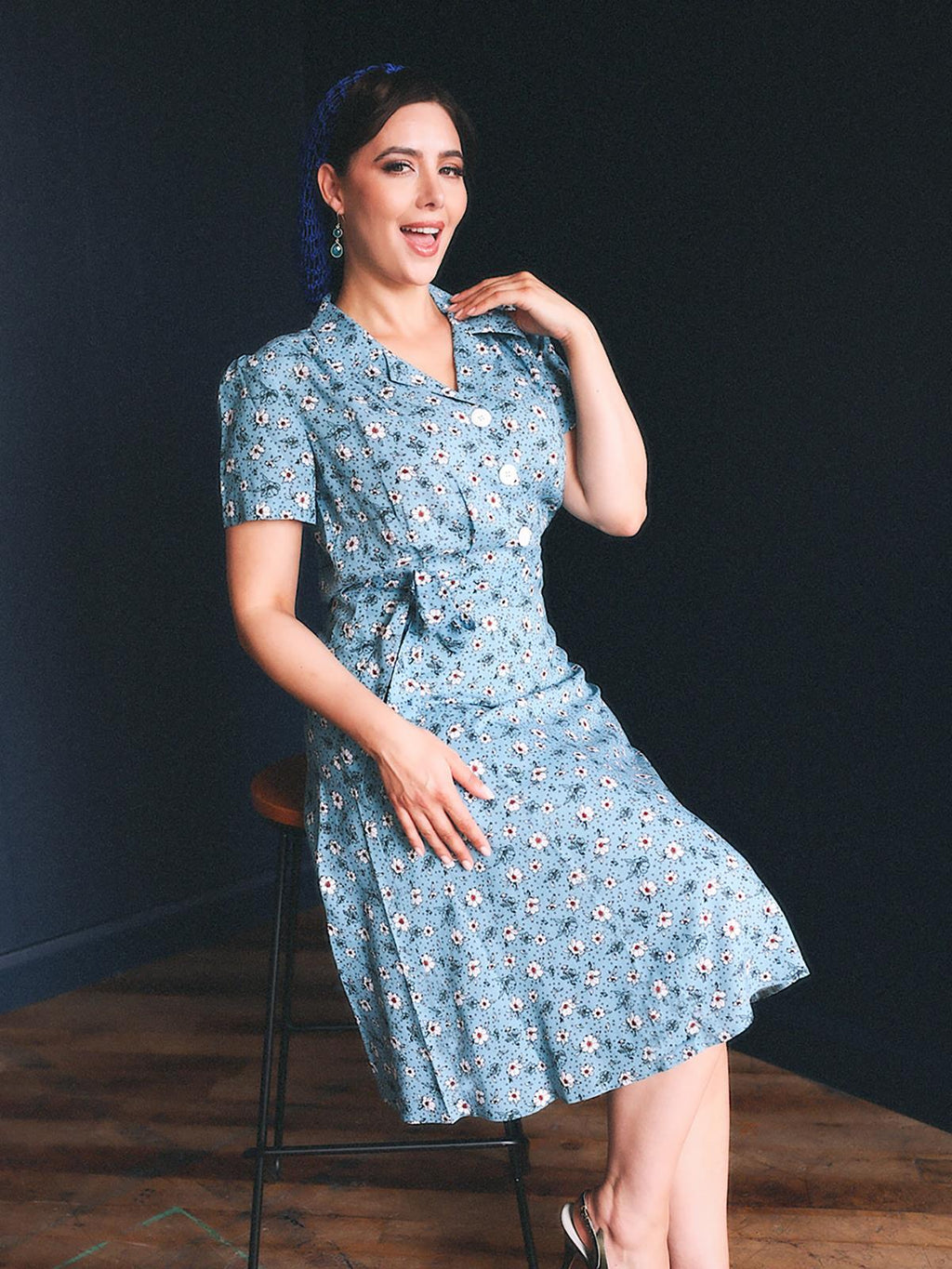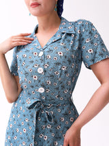 1940s Inspired Blue Ditsy Floral Shirt Dress