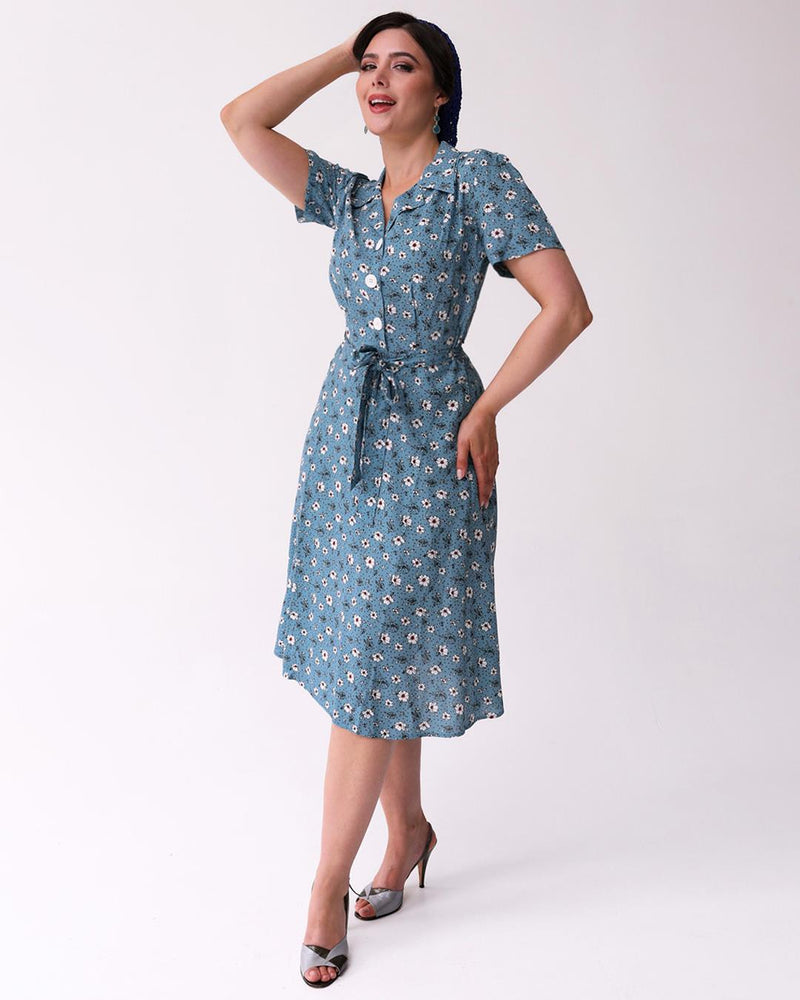 Adorn this charming 1940s vintage-style shirt dress, which showcases a delicate ditsy floral print in a soothing cornflower blue hue.