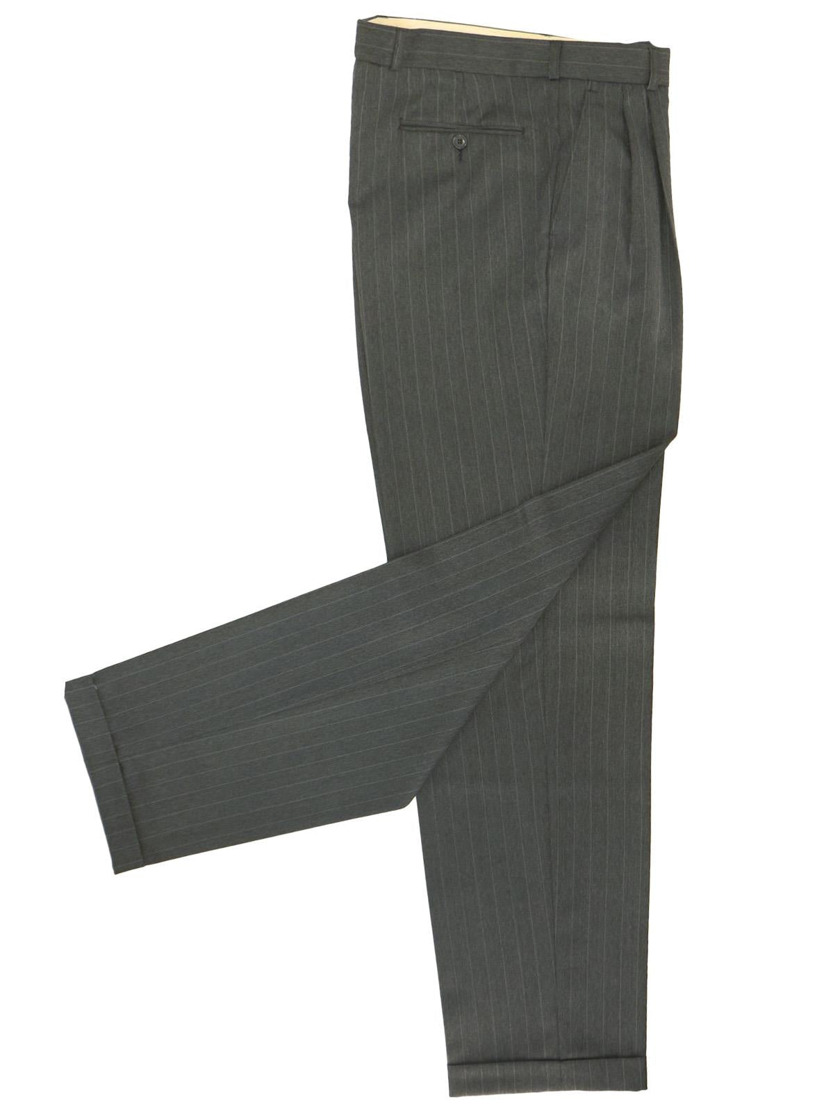 The matching trousers have pleated fronts, with two slanted side pockets and a single bound pocket at the back.