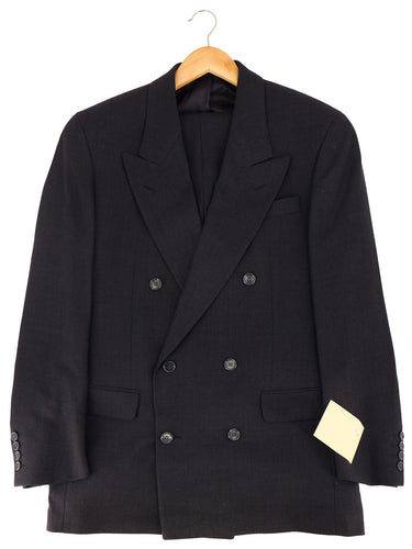 Ideal for reproducing the 1940s demob look, this original nineties vintage deadstock tailored suit is realised in a navy wool blend bird's eye fabric.
