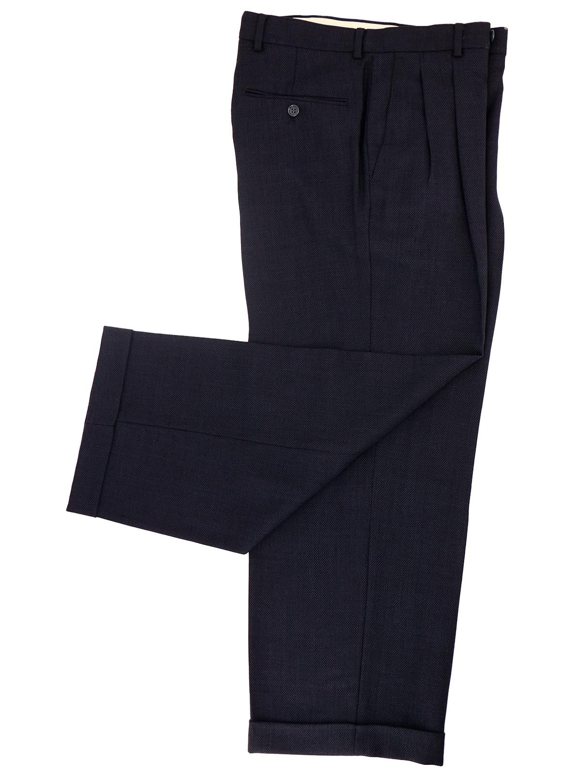 The matching trousers have turn-up cuffs, double pleated fronts, and bound back pockets.