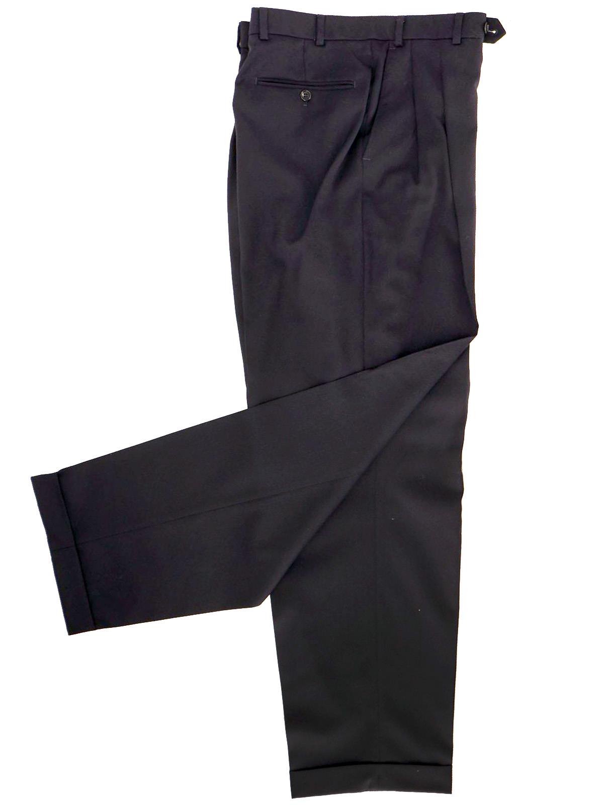 The matching trousers have double pleated fronts and turn-up cuffs. Two side pockets and two bound back pockets.