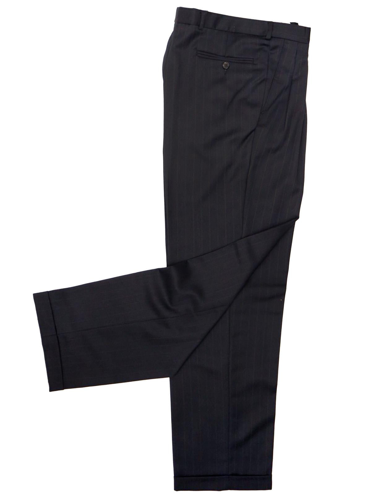 The matching trousers have turn-up cuffs, double pleated fronts, and bound back pockets.