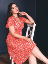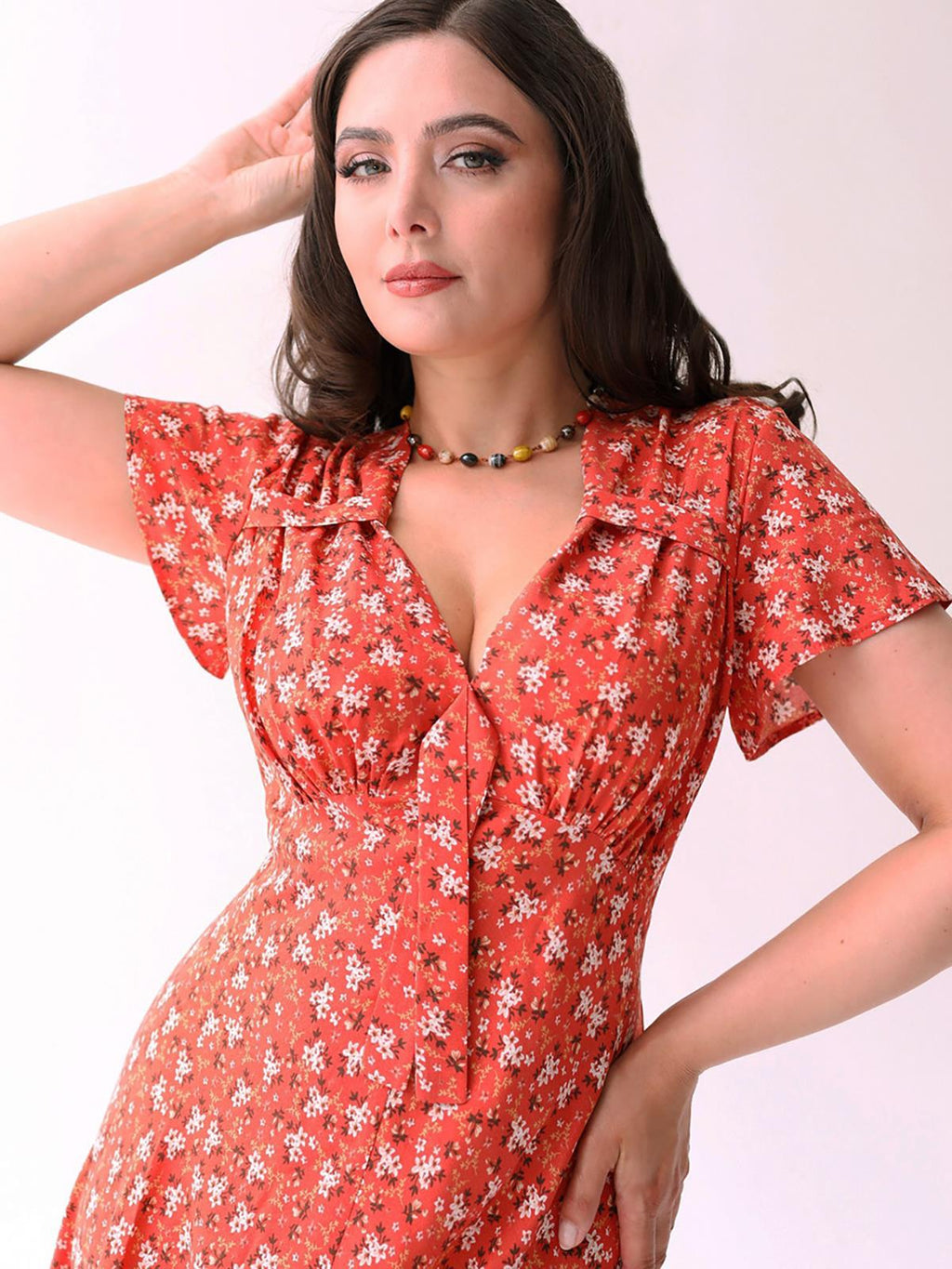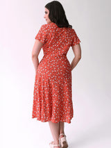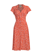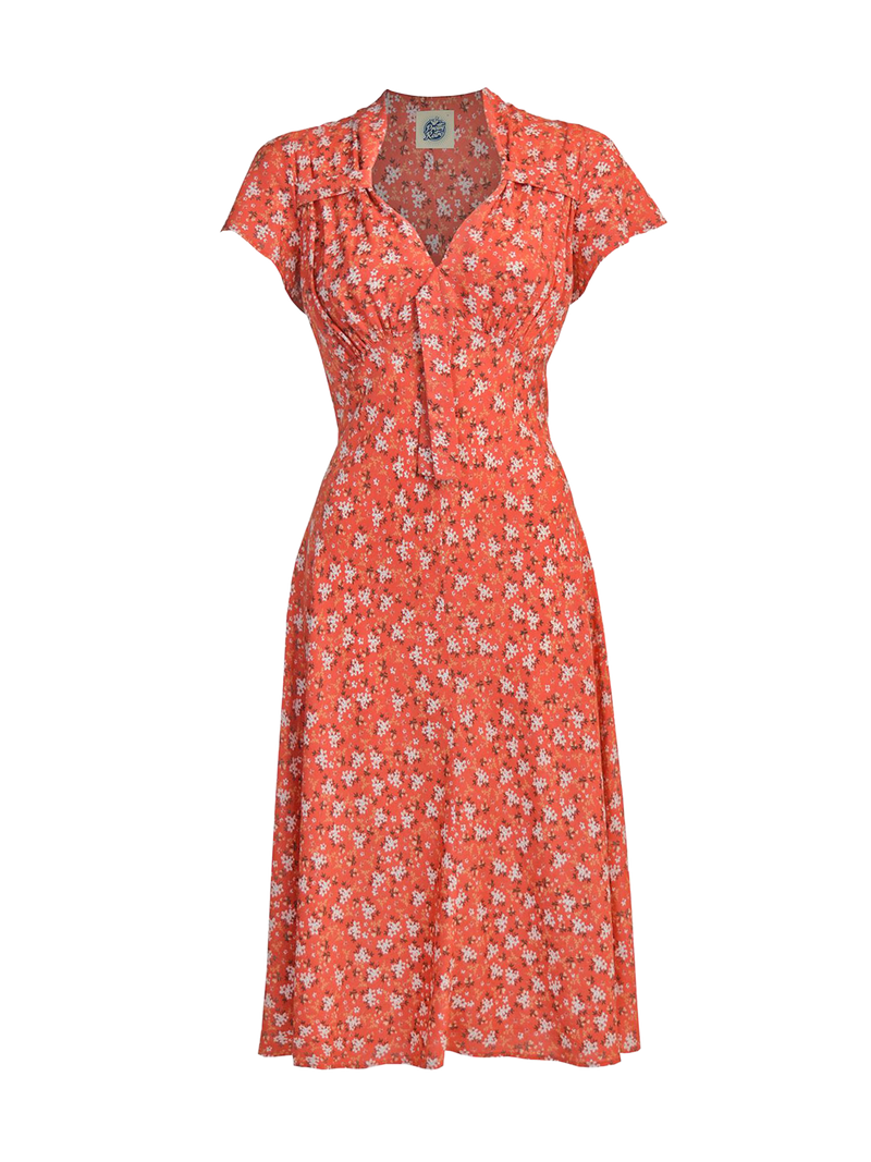 This gorgeous dress draws inspiration from 1940s fashion, featuring a sweetheart neckline and a delightful pattern of white flowers against an apricot orange background.