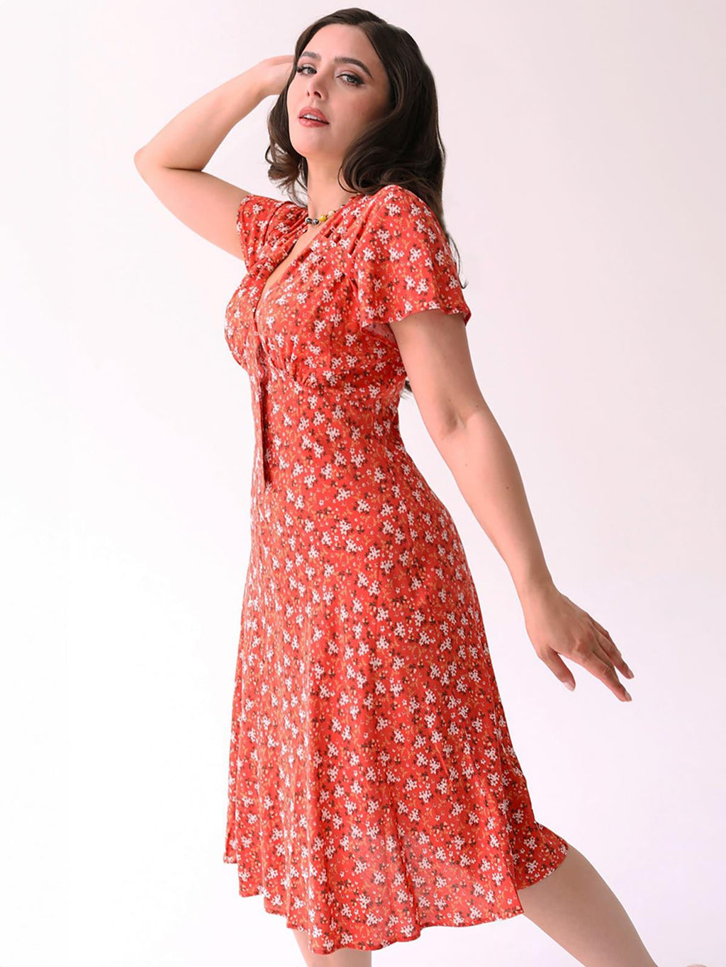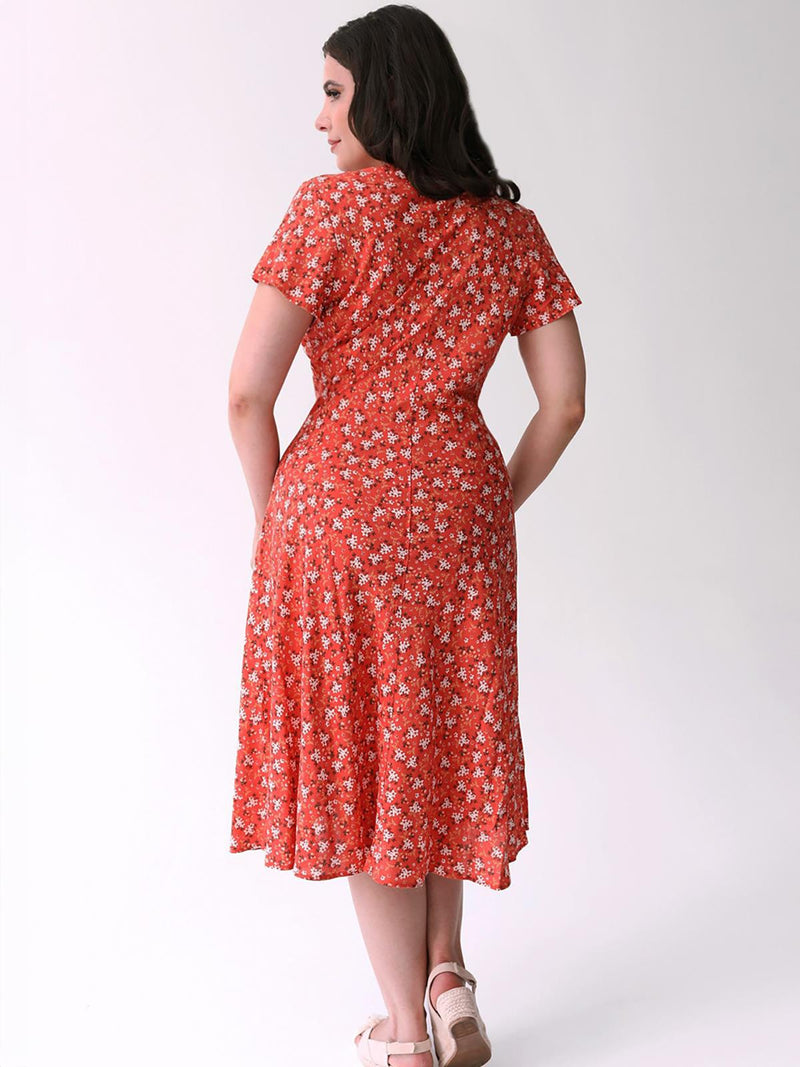 1940s Look Coral Ditsy Floral Tea Dress