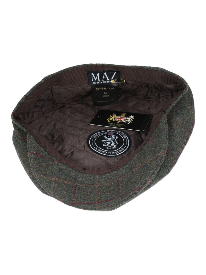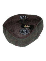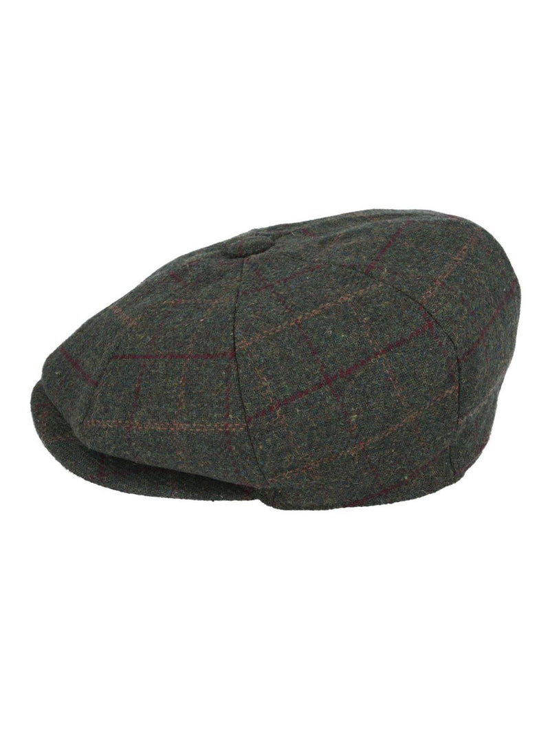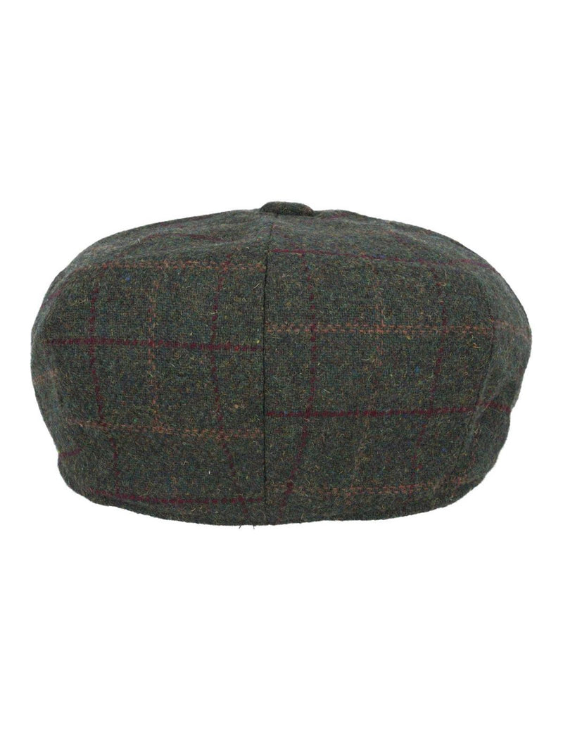 Green herringbone 8 panel newsboy cap with dark green and red large check.
