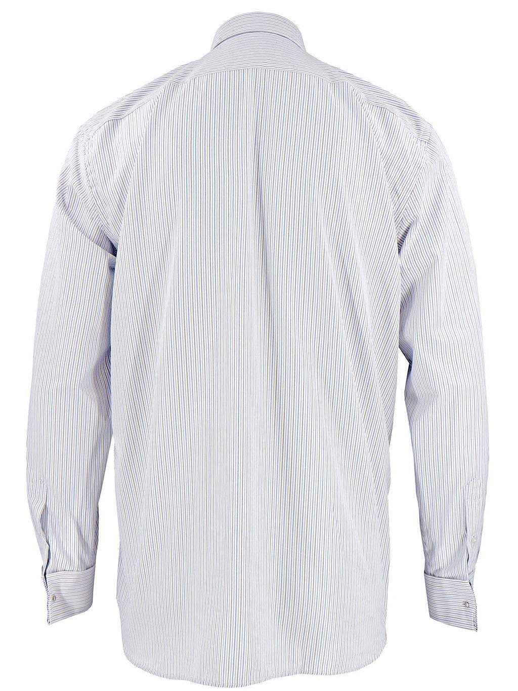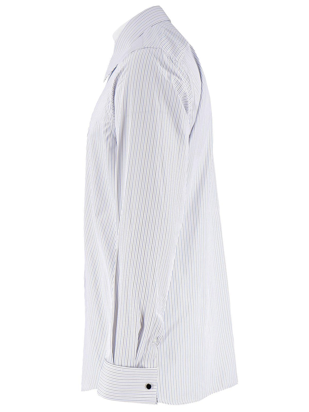 The shirt has shoulder and back yokes, and hem godets at the side seams make it a comfortable choice. It features French cuffs with included black cufflinks. The shirt is both easy care and high quality.