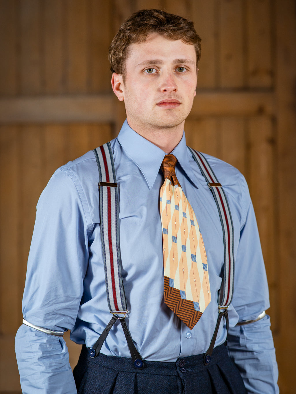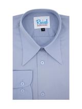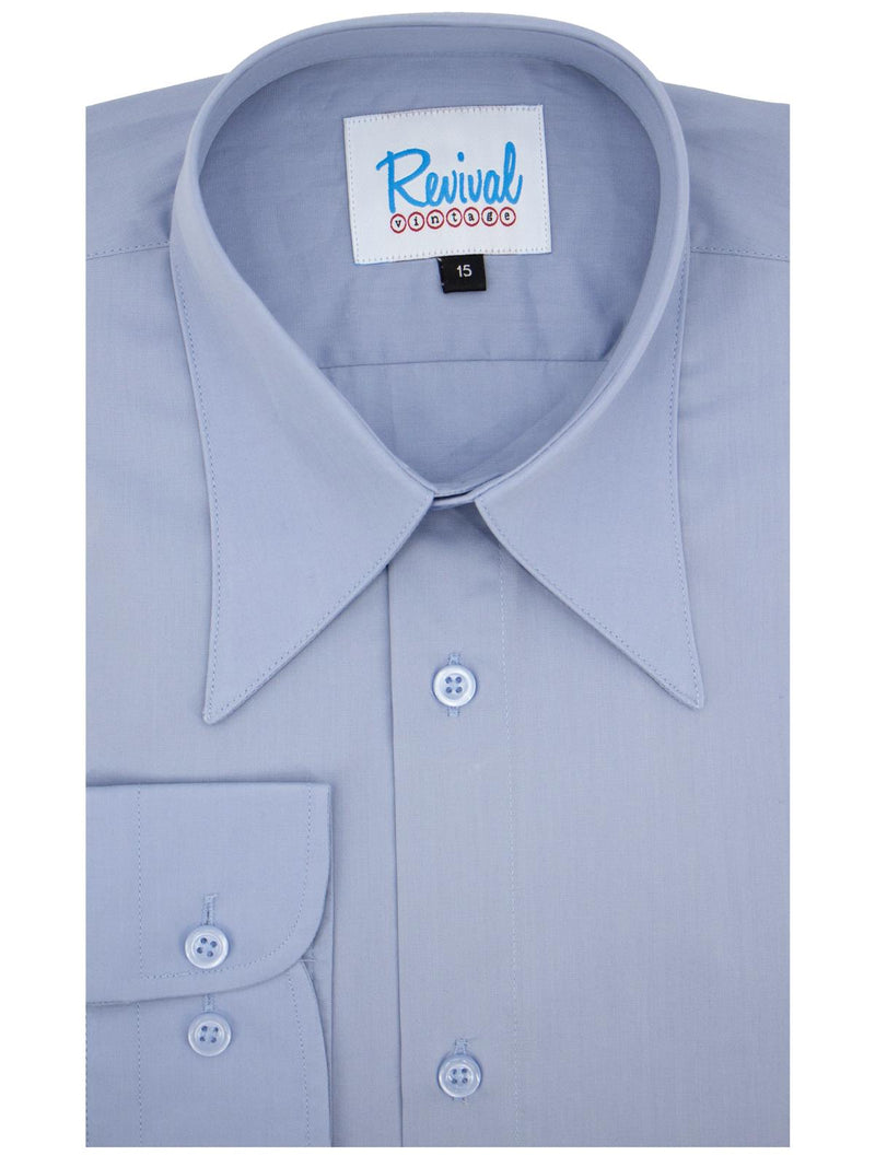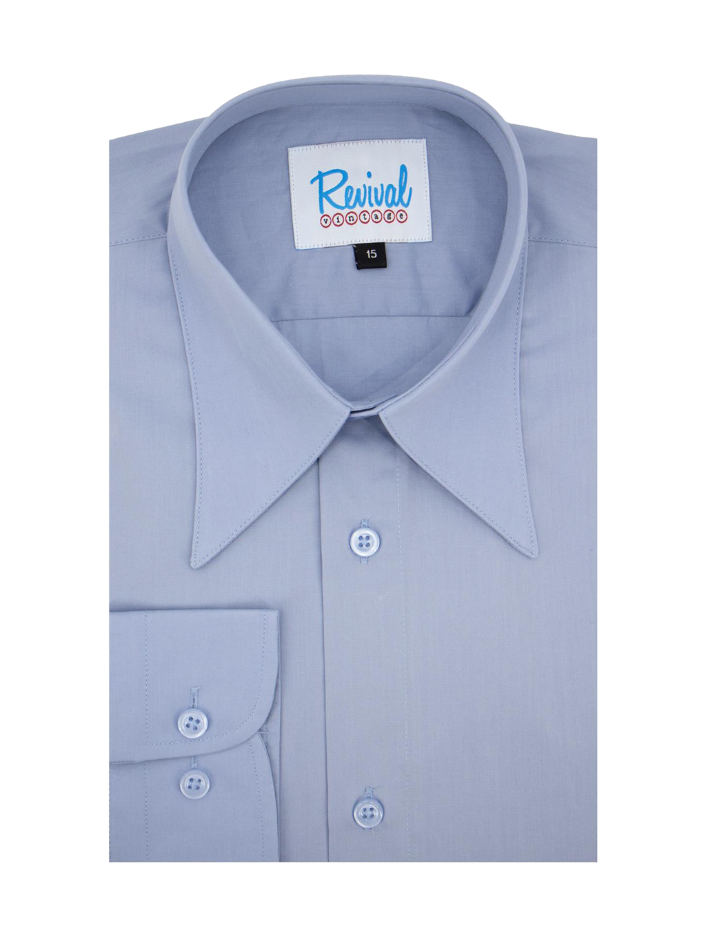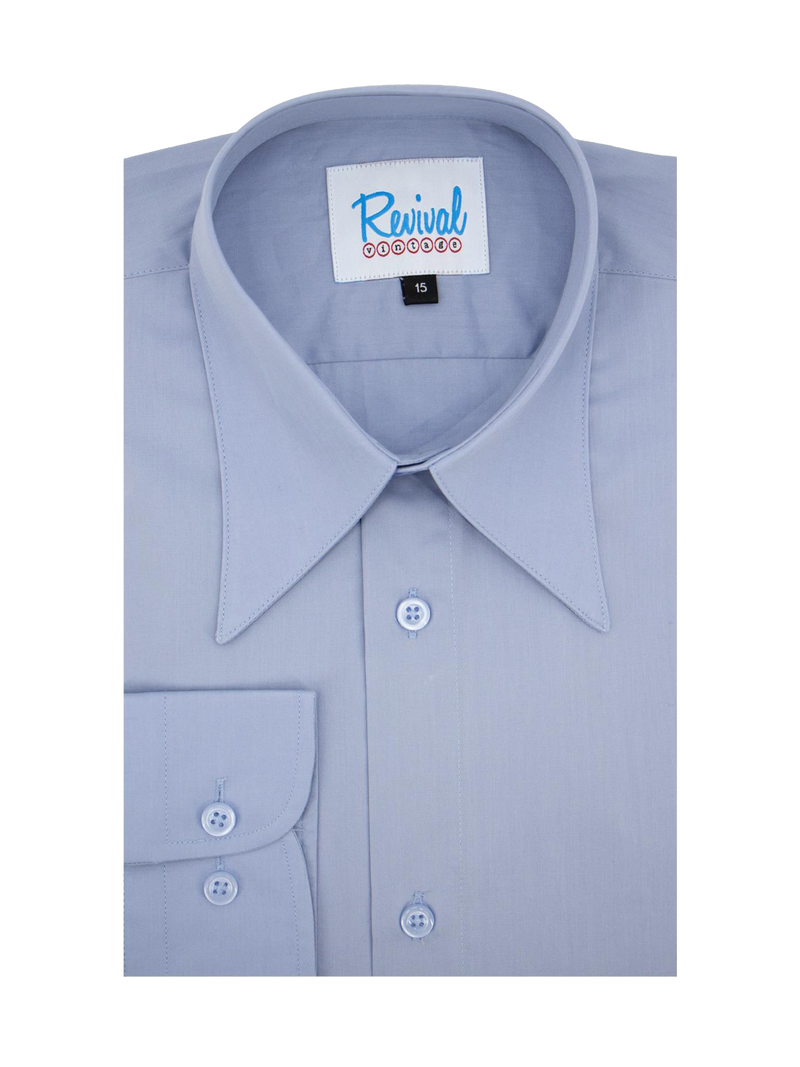 1940s vintage style cotton rich shirt with a spearpoint collar in a classic light blue.