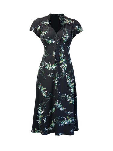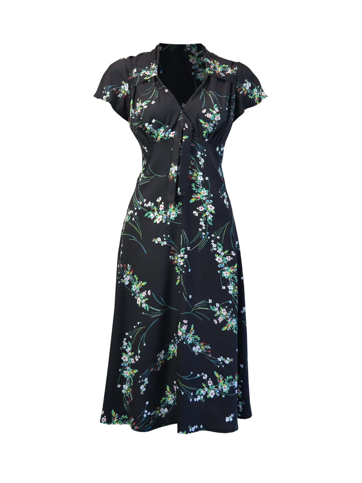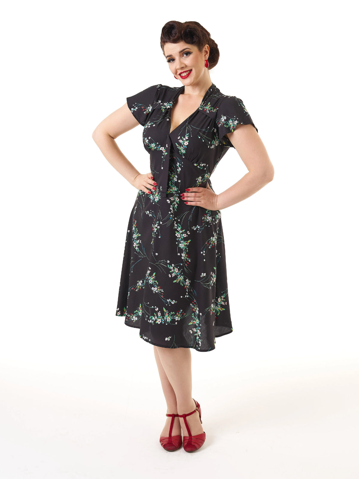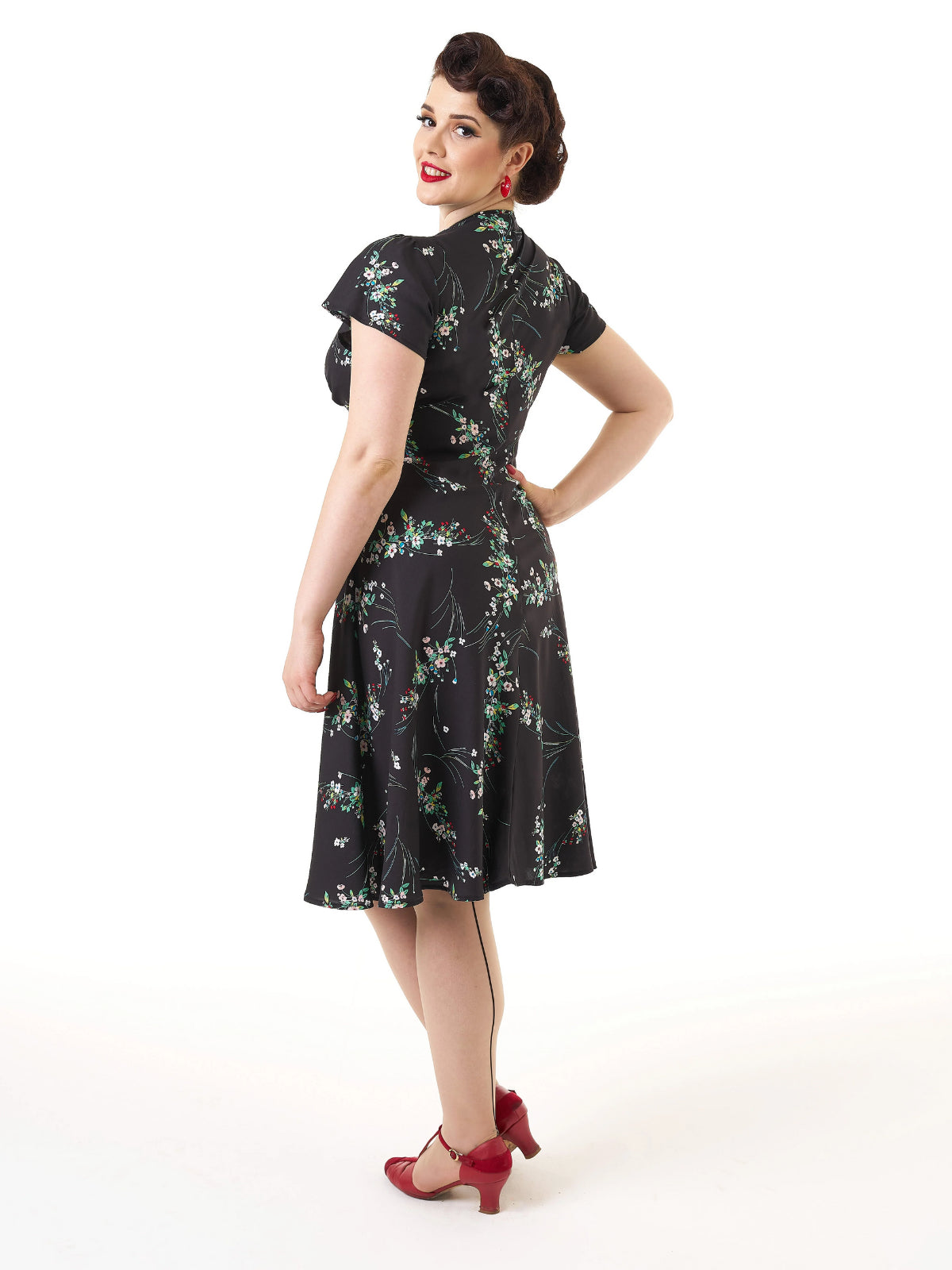 This charming vintage-style tea dress captures true 1940s elegance with its flattering sweetheart neckline and romantic multicoloured floral bouquet print set against a classic black background. The bias-cut design drapes beautifully over the body, creating a smooth, feminine silhouette that celebrates timeless retro glamour.