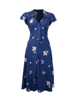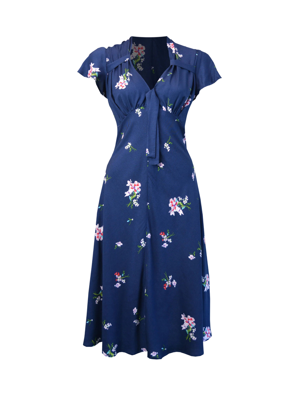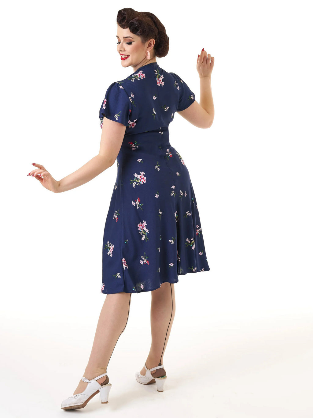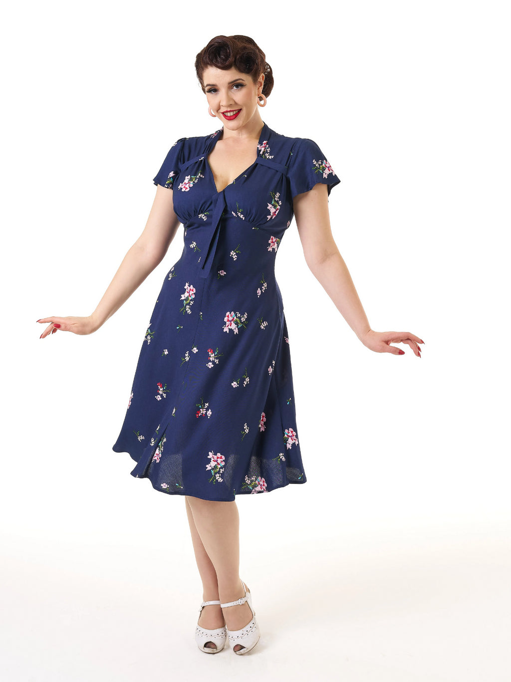 This flattering tea dress draws inspiration from 1940s fashion, featuring a sweetheart neckline and a pink bouquet pattern against a royal blue background.