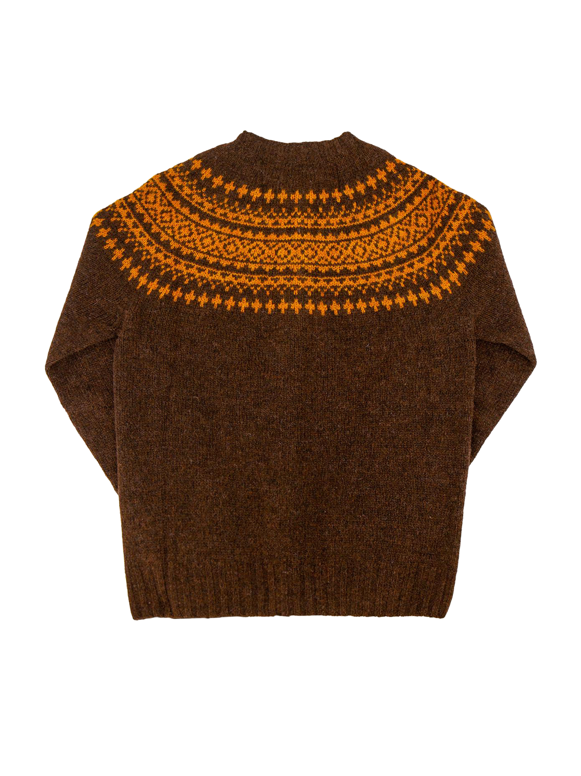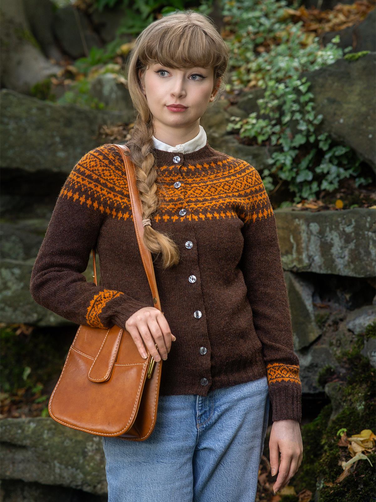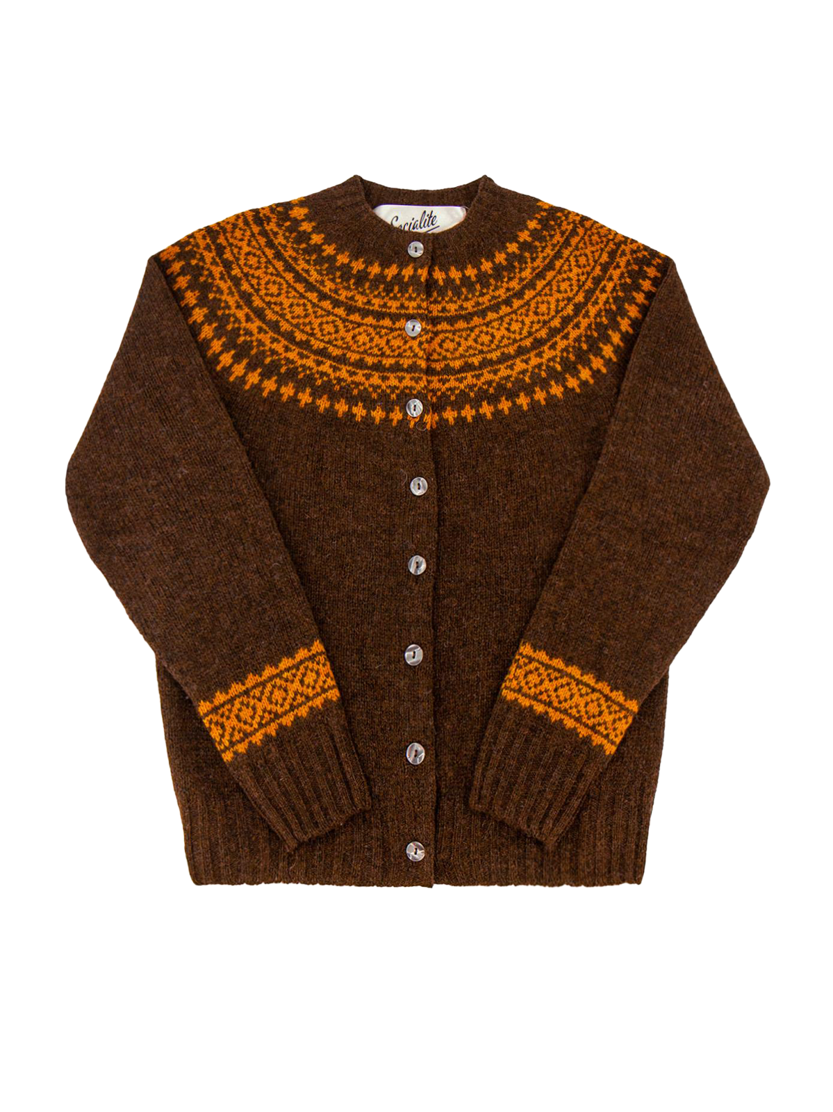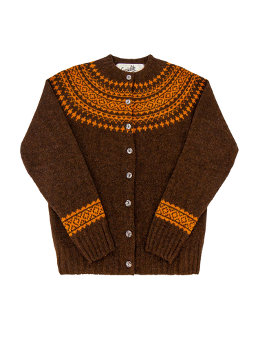 Authentic forties look cardigan in a rich brown shade with orange detailing in the Fairisle pattern. Each of our Scottish knitwear pieces are handmade in a traditional knitting method which takes inspiration from decades past, including 1940s and 1950s fashion.